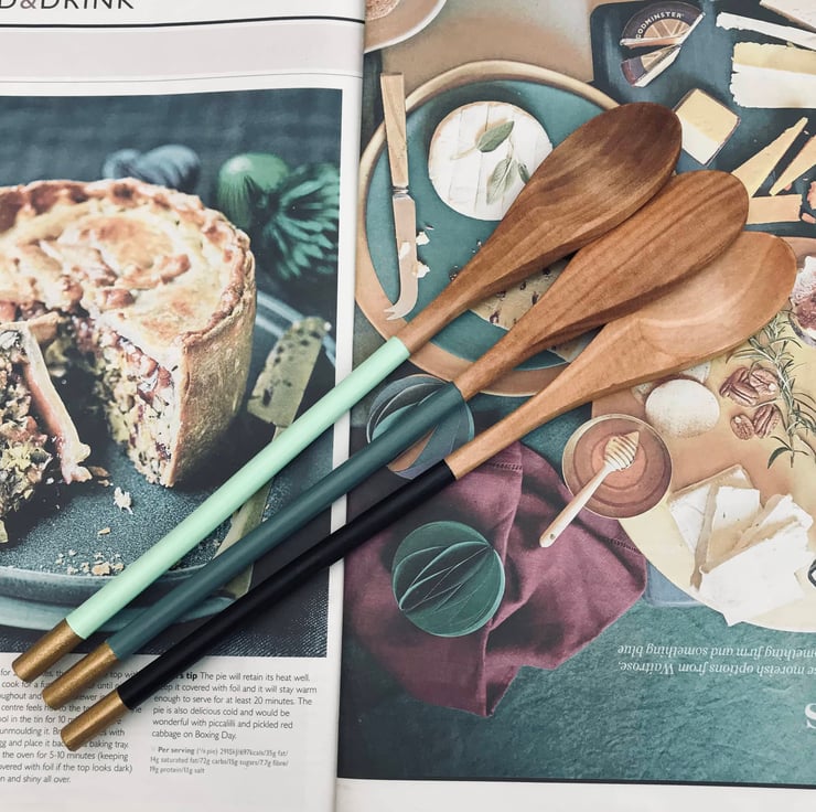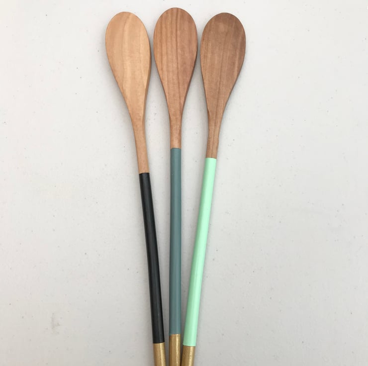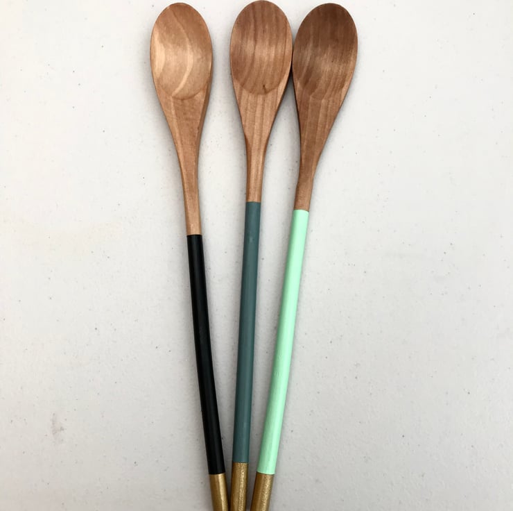 A set of 3 wooden cooking spoons, 12" in length, 1.5” wide at the spoon end. The handles have been carefully painted in tonal colours and tipped with gold. The paint has been cured in a moderate oven and the exposed wood has then been treated with a food safe “Butcher’s Block” oil. Hand washing in warm soapy water is recommended, or top rack of dishwasher if you must :)