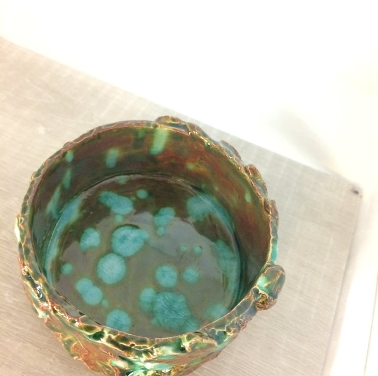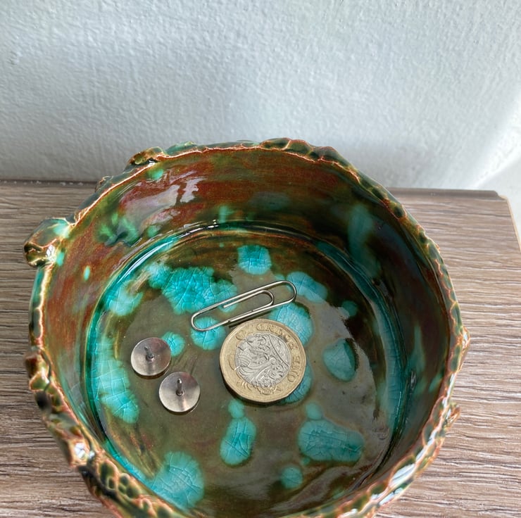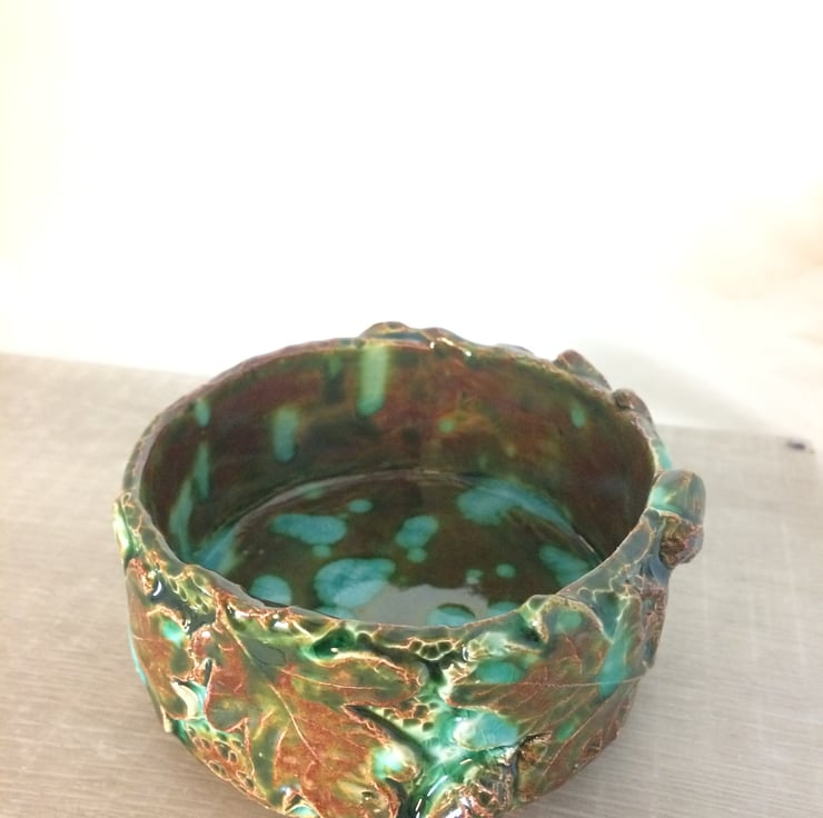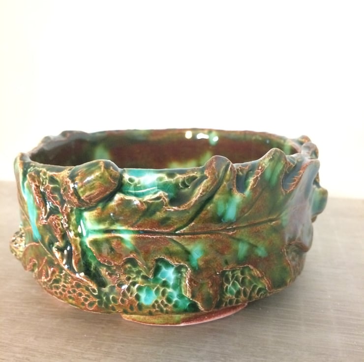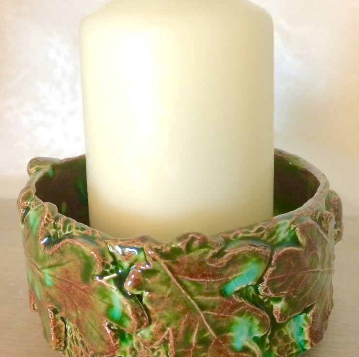 Ceramic oak themed pot, 85mm diameter, with little feet making it perfect for nibbles, bits and bobs or to hold a candle. Handmade and fired with earthenware forest fantasy green glaze. The pot was slab built and each oak leaf added individually, making this a unique piece.