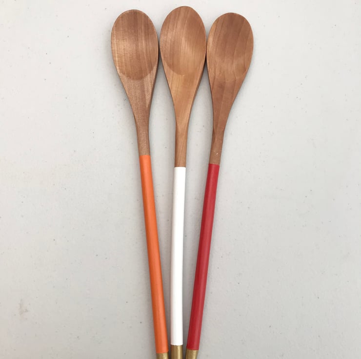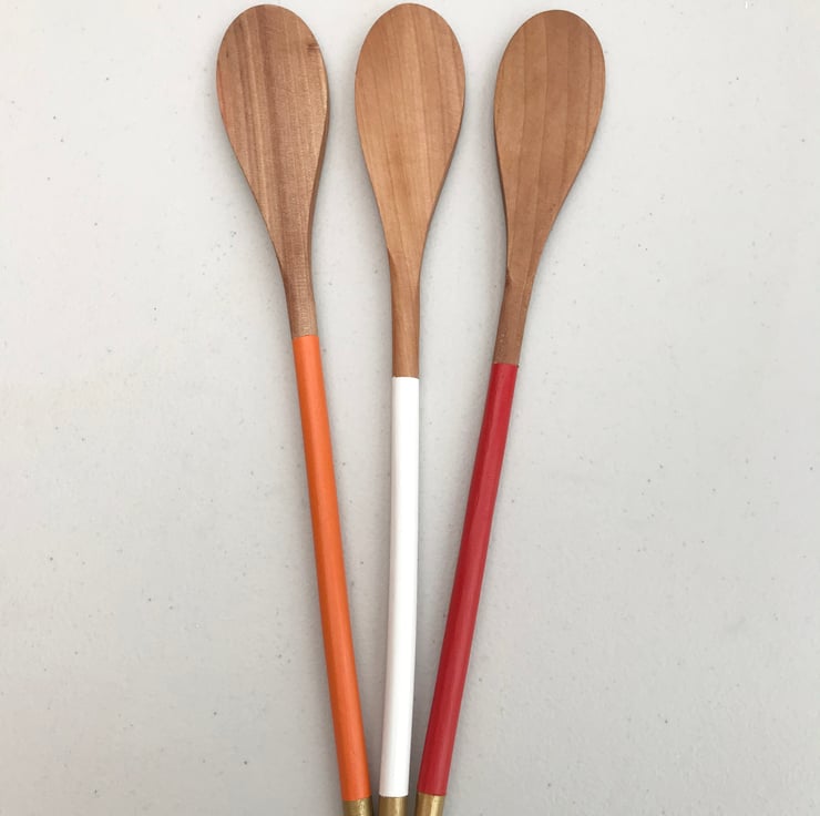 A set of 3 wooden cooking spoons, 12" in length, 1.5” wide at the spoon end. The handles have been carefully painted in tonal colours and tipped with gold. The paint has been cured in a moderate oven and the exposed wood has then been treated with a food safe “Butcher’s Block” oil. Hand washing in warm soapy water is recommended, or top rack of dishwasher if you must :)