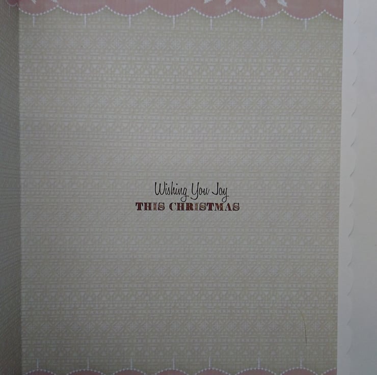 The inside of the card has a double full colour insert with a printed sentiment that says "Wishing You Joy This Christmas" and there is plenty of room for you to write your own special message.