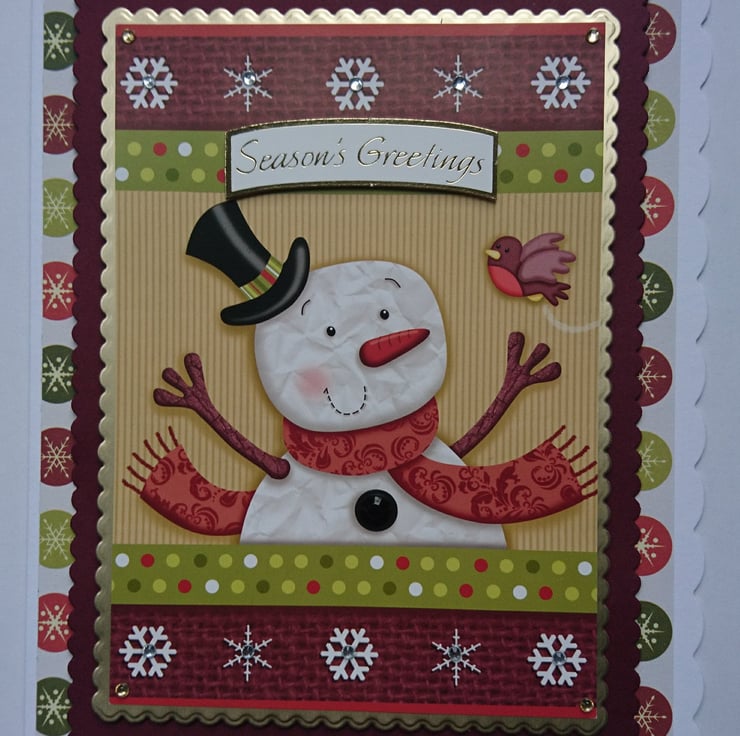 A happy snowman surrounded by snowflakes is sending you Season's Greetings, doesn't he look smart in his top hat and scarf? A cute robin has come to join in too.