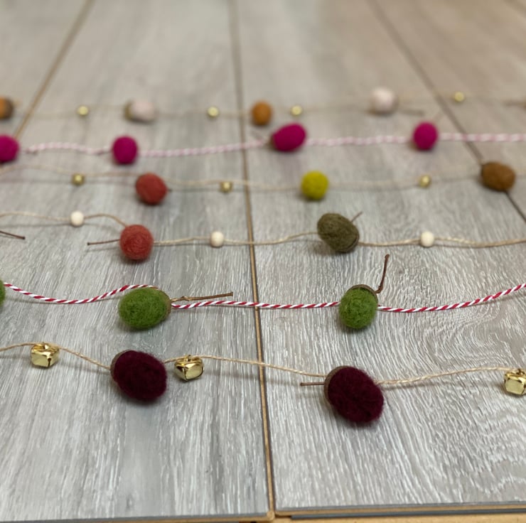 Pretty handmade garland using sustainably sourced wool, foraged acorn caps natural twine and tinkling bells.