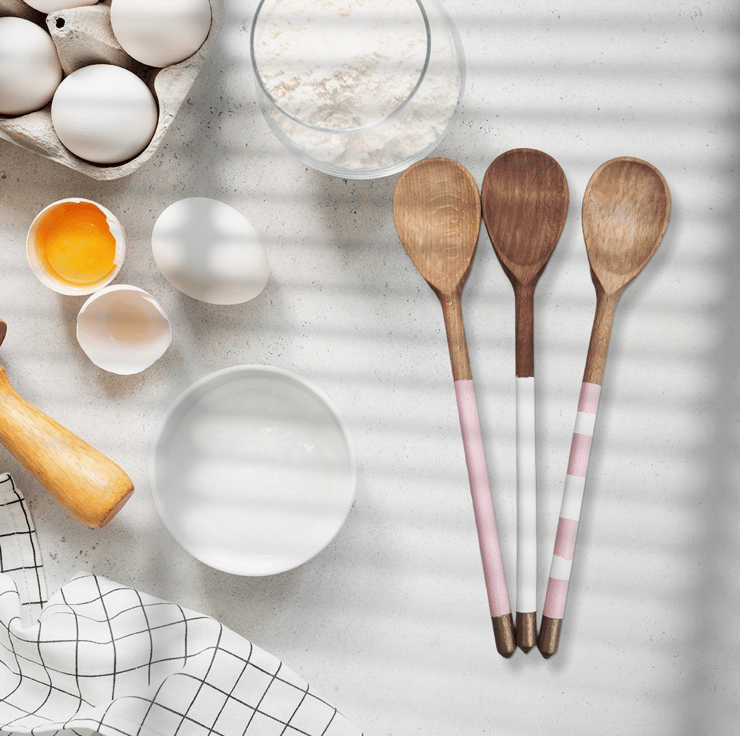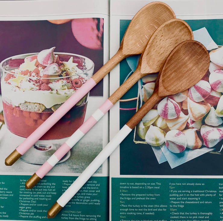I like to take a mundane object and make it special. One Candy-floss pink n white stripes, one Candy-floss pink, and one charmingly clean white, each with a gold tip. I want these fun spoons to be a real pleasure to use or simply to bring a little joy as a decorative item in your kitchen