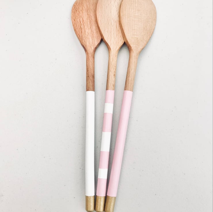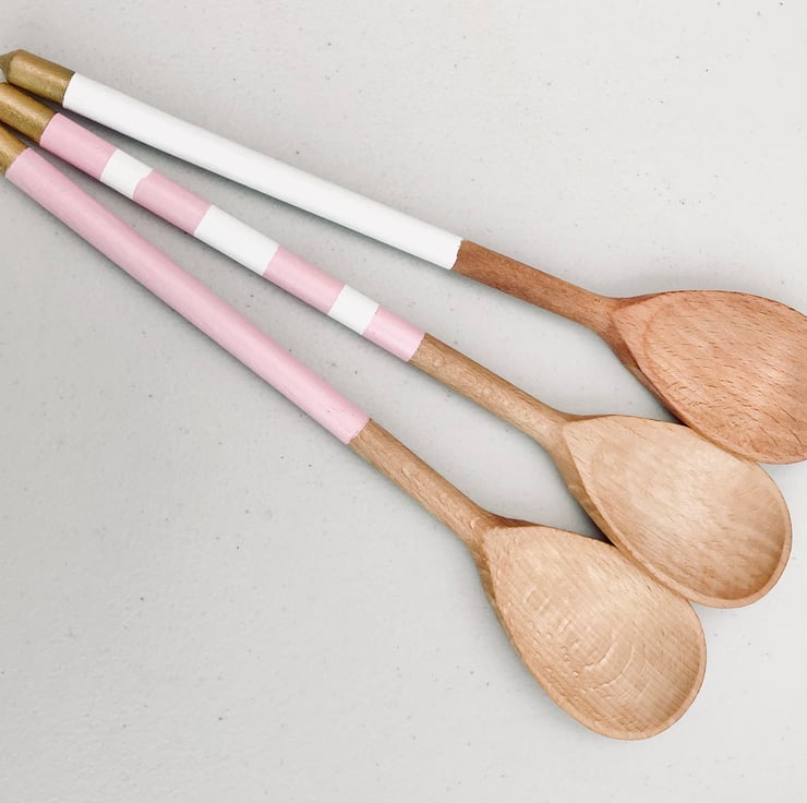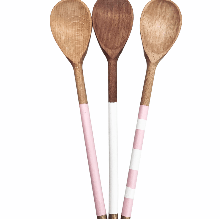 A set of 3 wooden cooking spoons, 11.5" length and 2" wide at the spoon end. The handles have been carefully painted in cheery pastel colours, each with a gold tip. The paint has been dry cured in a moderate oven and then the exposed wood has been treated with a food safe “Butcher’s Block Oil". Hand washing in warm soapy water is recommended, or top rack of the dishwasher if you must :) I will include a set of care instructions with each order.