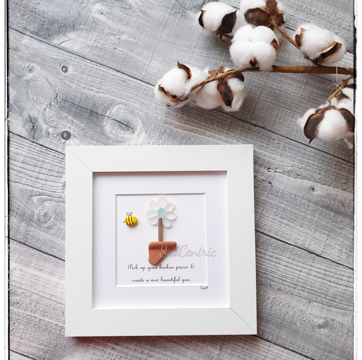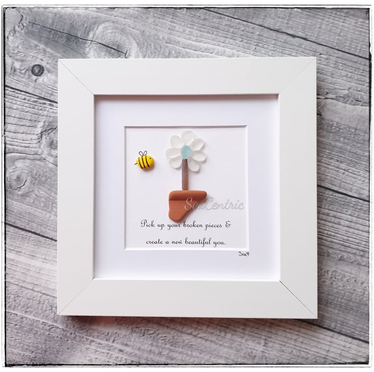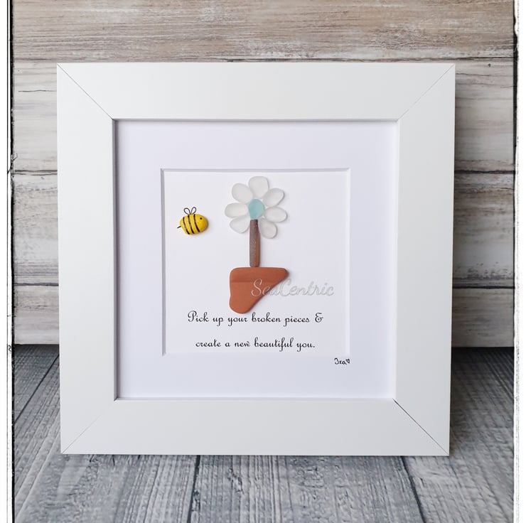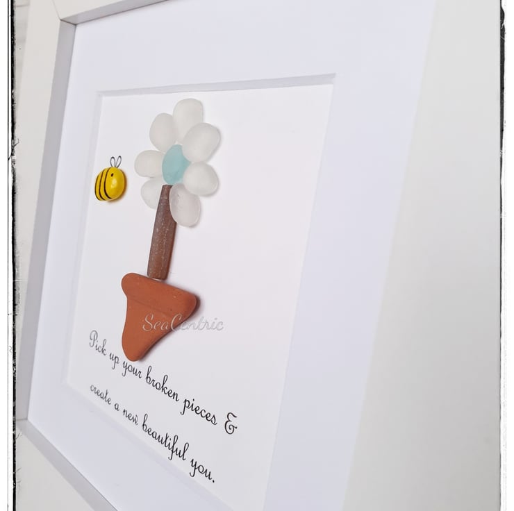 This artwork was created with seaglass and seapottery with an inspirational quote on watercolour paper. A beautiful and thoughtful gift to inspire someone to keep going despite being broken by life and circumstances.
