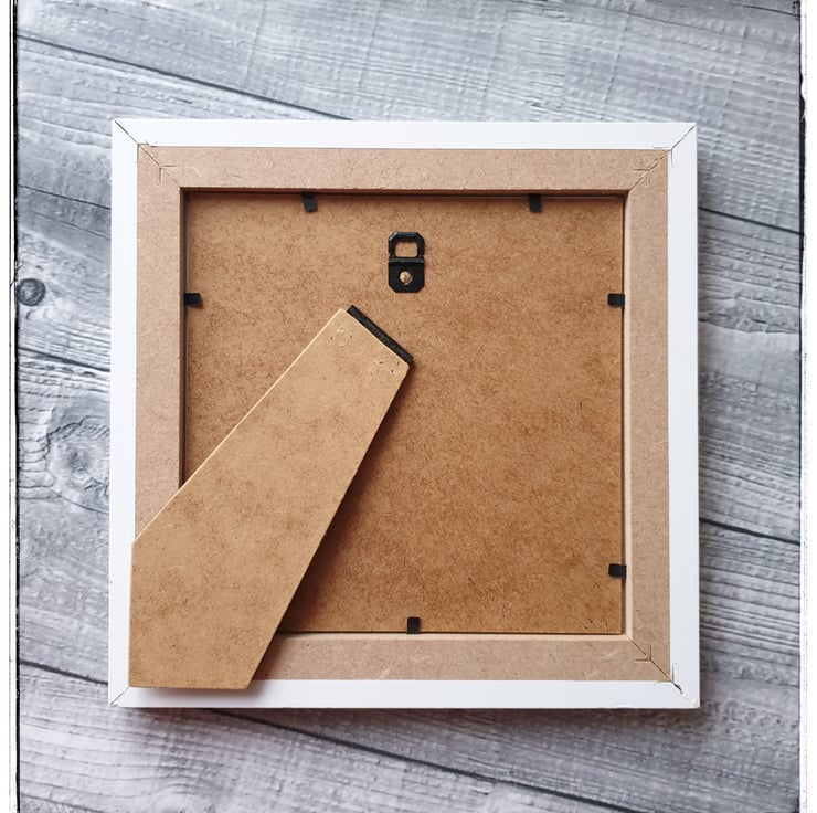 The white frame measures appropriately 20cm x 20cm. The frame will come without glass. Please keep away from young children.