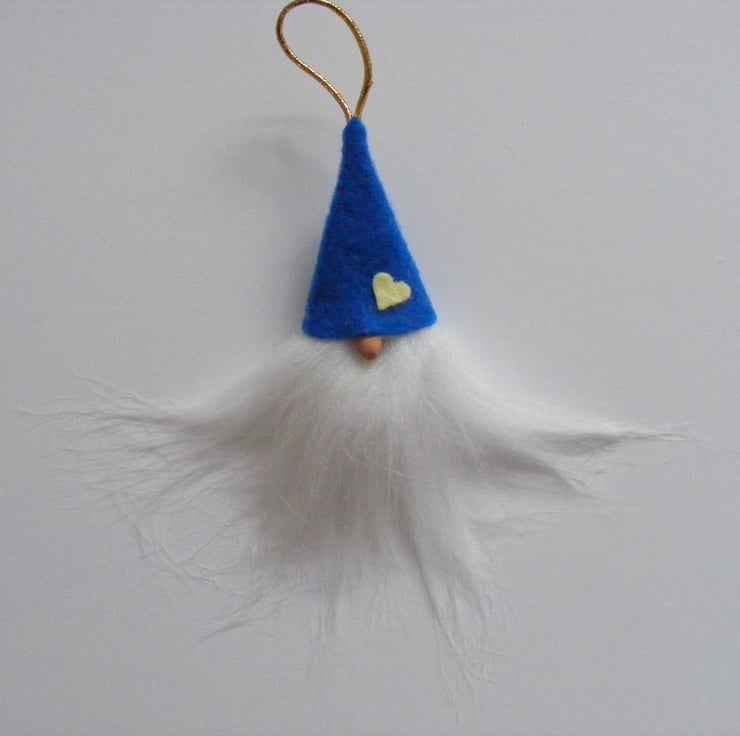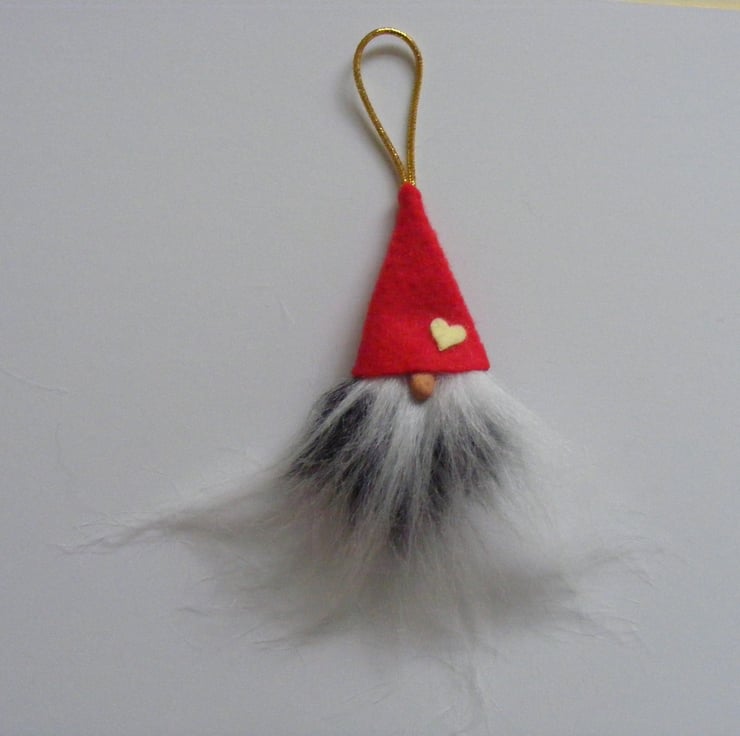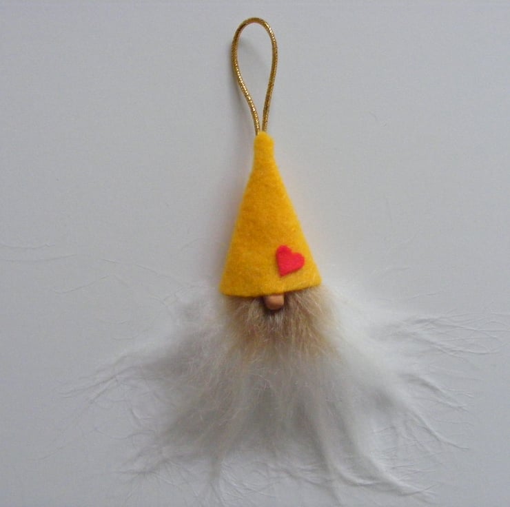 These cute little gnomes are made from wood slices. They have felt hats and clay noses and faux fur beards. They have a heart on their hats and a gold hanging loop.