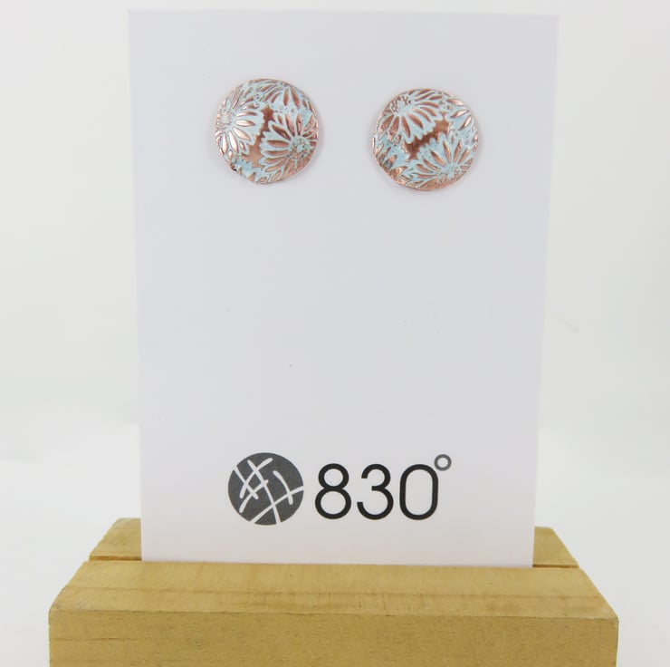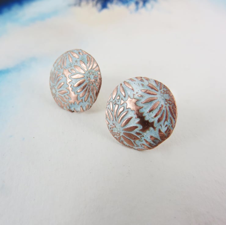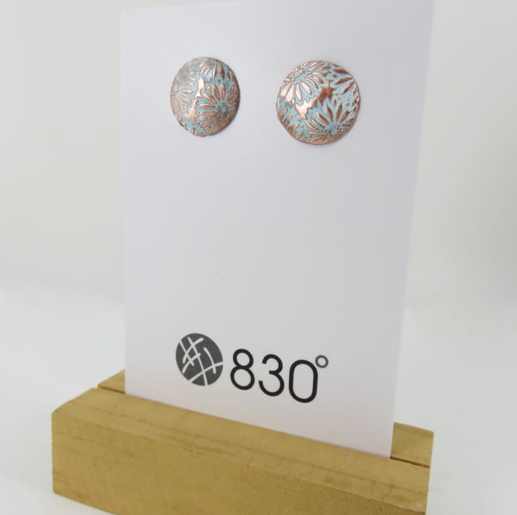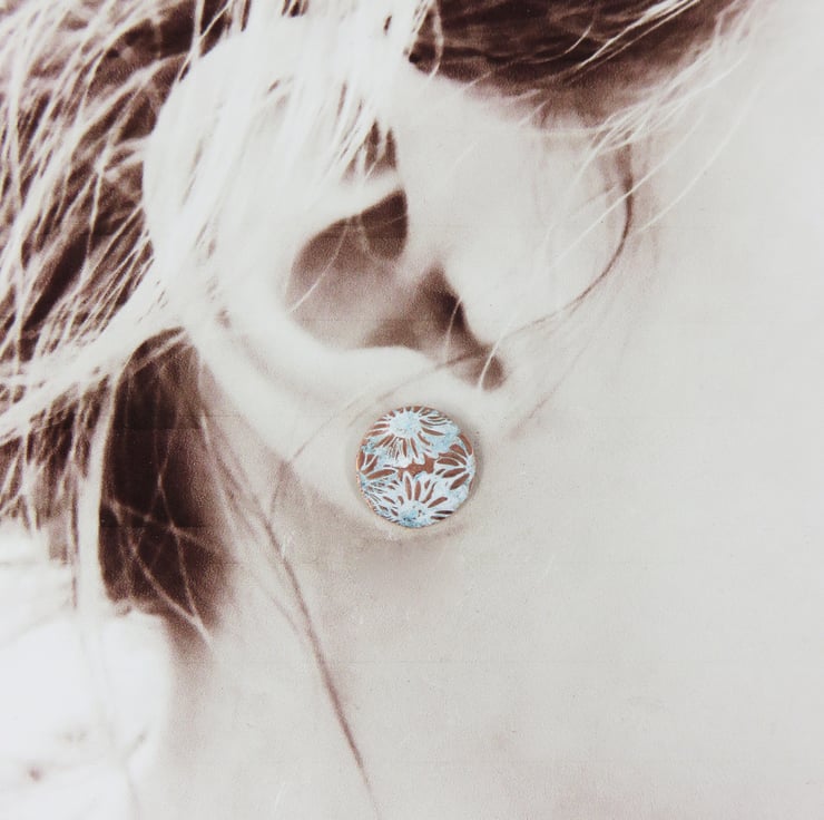 13mm circle copper stud earrings decorated with a daisy texture and washed with white and blue enamel. Domed slightly. Some raised areas are sanded back to reveal the copper beneath. Silver posts are soldered on the backs. Fired in the kiln at 830 degrees. Posted out in a gift box with information about the enamelling process.
