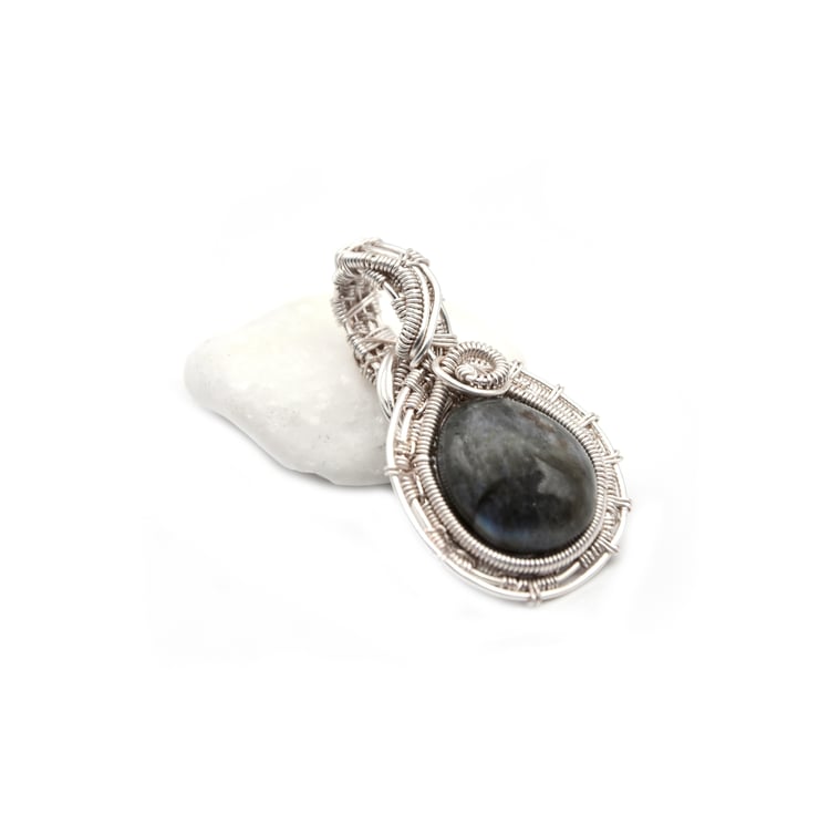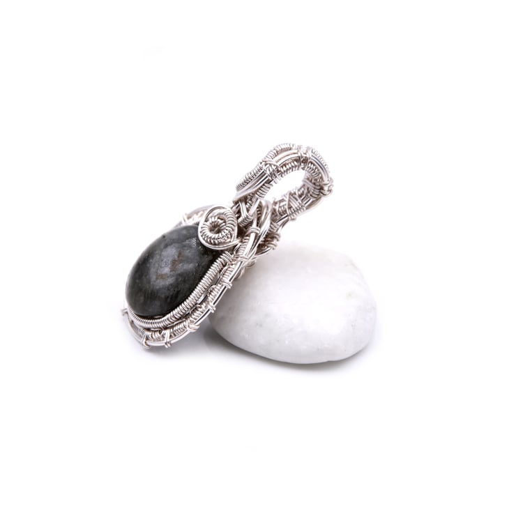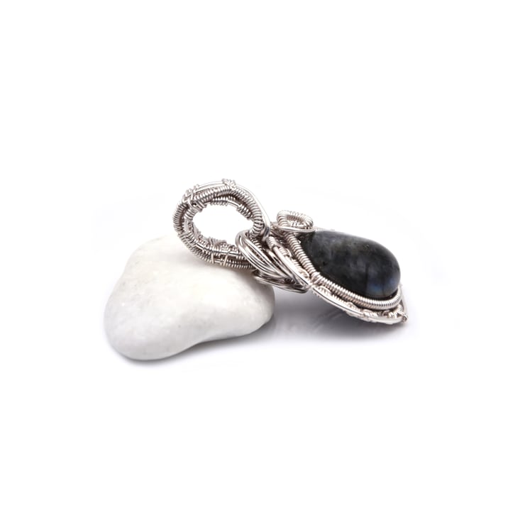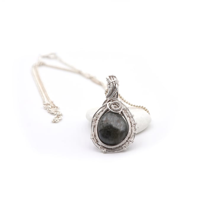 The pendant is wire wrapped in silver plated copper wire; with a grey green labdradorite stone.
