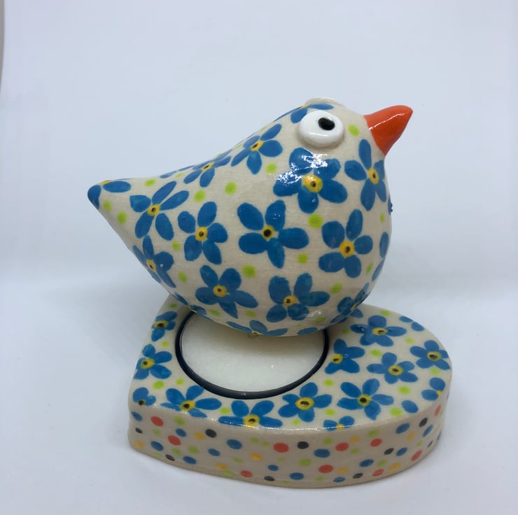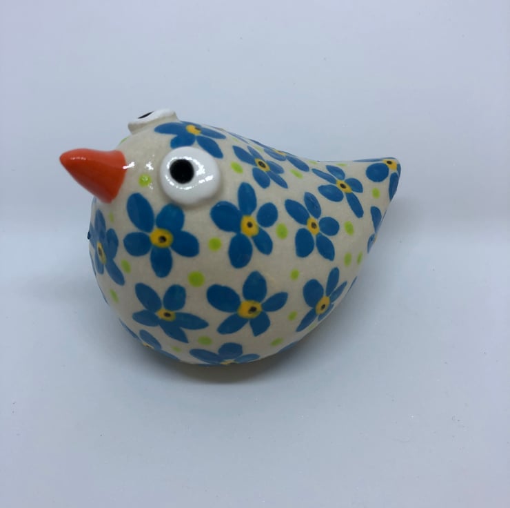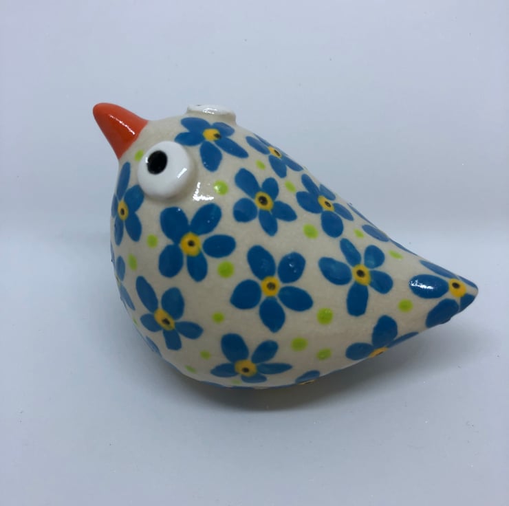 This pretty little forget-me-not bird has been hand built from a little clay pinch pot. After biscuit firing it’s been handpainted with coloured underglazes and then finished off with a transparent shiny glaze. Measuring around 8cms from the tip of it’s beak to the tip of it’s tail, it comes supplied in it’s own little perky bird straw lined gift box.
