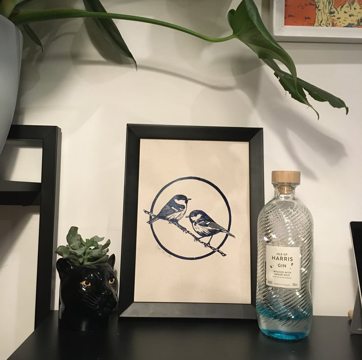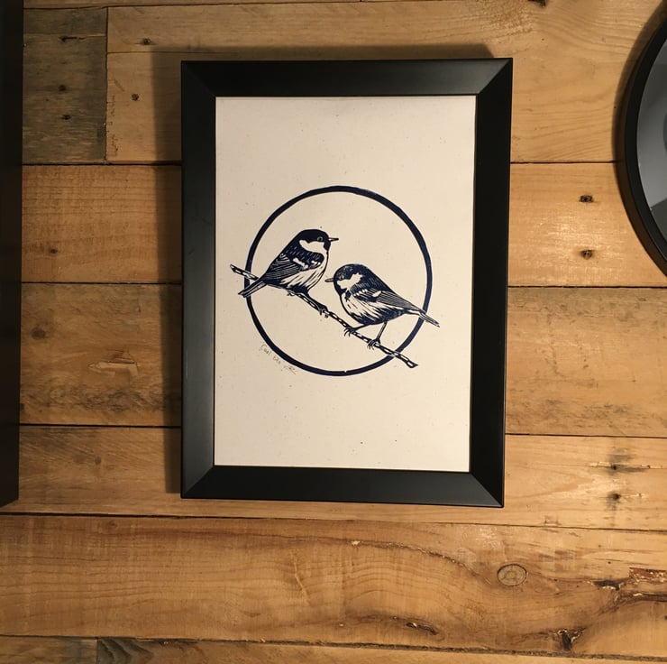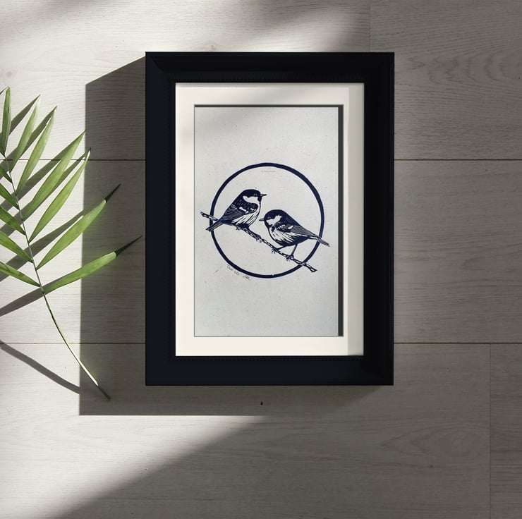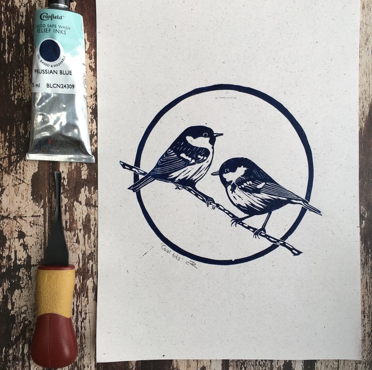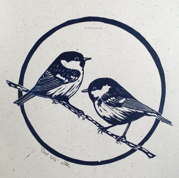 A4 lino print of coal tits. Printed in prussian blue oil paint on 120gsm 100% recycled paper, which has an off-white flecked appearance. This print is unframed.