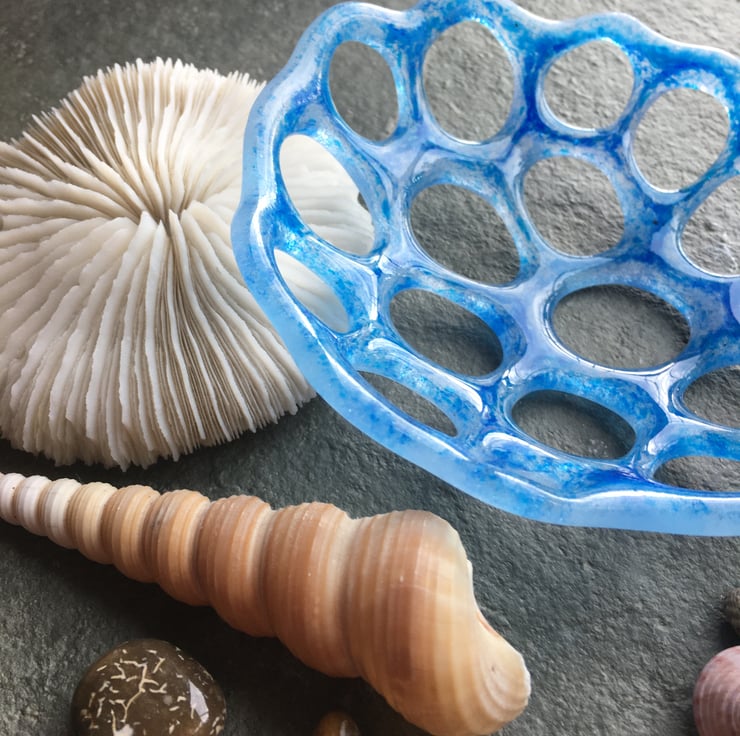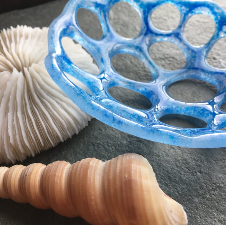 I recycle offcuts of fused glass, to create these bowls carefully combining colours and shapes, and fire them twice in a kiln to make a dainty, lace-y organic glass structure.