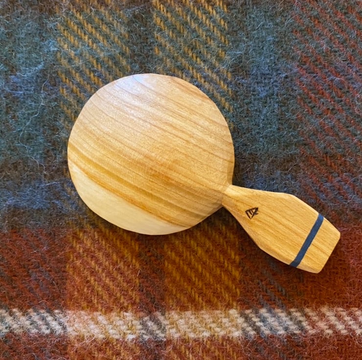 The scoop has been made from a freshly cut log, which was taken to its final shape using traditional methods- splitting the log firstly into a 'blank' using a froe tool, drawing on a rough shape before axing this out and then finalising the shape using an array of knives. This leaves beautiful cut facets which mean no sanding is required. After drying, the scoop receives a final shaping by knife, before the handle is painted using food safe milk paint and a small makers mark is burned on. The scoop is then burnished using a smooth Scottish pebble leaving a silky feeling to the wood. And finally the wood is sealed using organic food grade linseed oil.