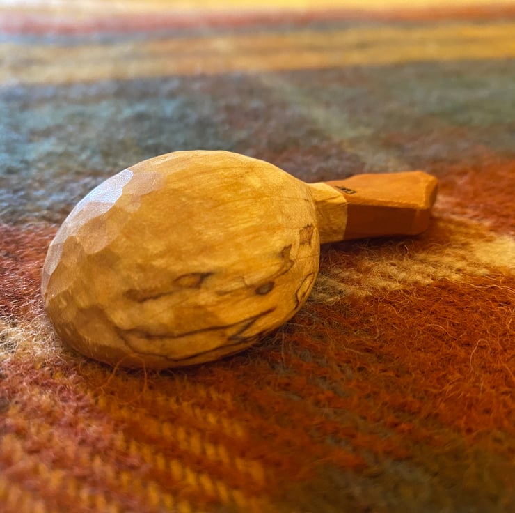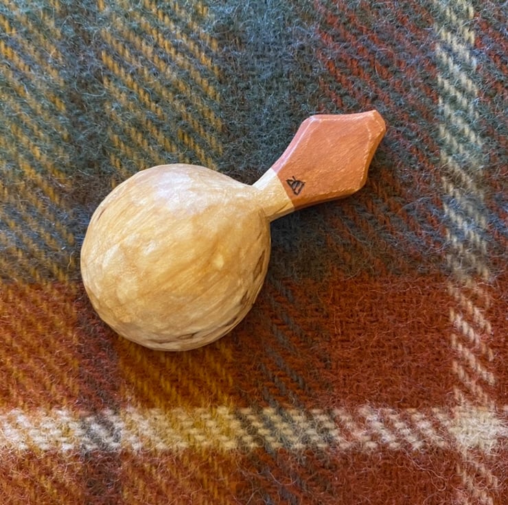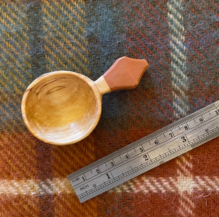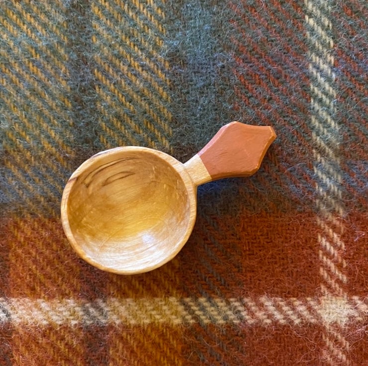 The scoop has been made from a freshly cut log, which was taken to its final shape using traditional methods- splitting the log firstly into a 'blank' using a froe tool, drawing on a rough shape before axing this out and then finalising the shape using an array of knives. This leaves beautiful cut facets which mean no sanding is required. After drying, the scoop receives a final shaping by knife, before the handle is painted using food safe milk paint and a small makers mark is burned on. The scoop is then burnished using a smooth Scottish pebble leaving a silky feeling to the wood. And finally the wood is sealed using organic food grade linseed oil.