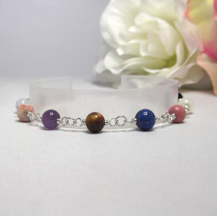 The crystals that make up the bracelet include sodalite, mother of pearl, green aventurine, amethyst, carnelian, blue lace agate, tigers eye, rose quartz, onyx, jasper, rhodenite, amazonite, agate, jasper.