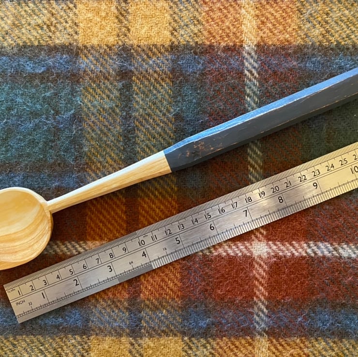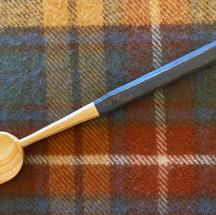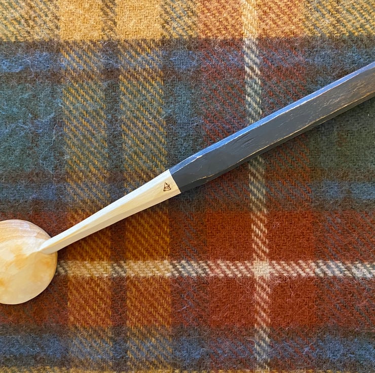 This spoon has been made using traditional methods splitting the material out from a fresh sawn log, sourced from a local tree surgeon. A rough shape for the spoon is then axed out, before moving onto a variety of knives to hone the shape. Once dry, the spoon has then been given two coats of food-safe milk paint to the handle area, followed by burning in my makers mark. The spoon has then been burnished with a scottish pebble and sealed using organic food grade linseed oil.
