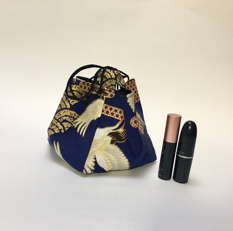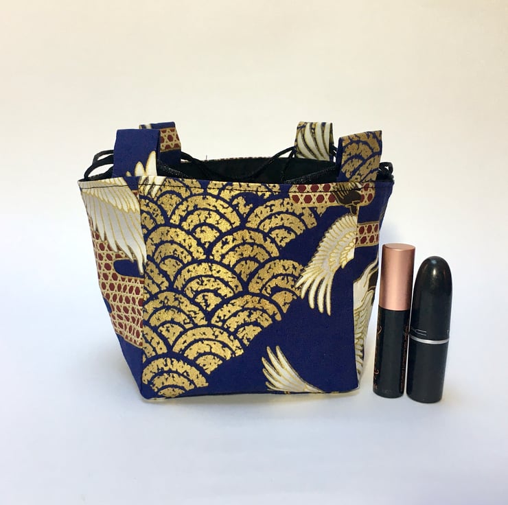 An extremely stylish Japanese cotton fabric has been used to create this Japanese rice bag. The fabric depicts cranes on a blue background with gold waves
