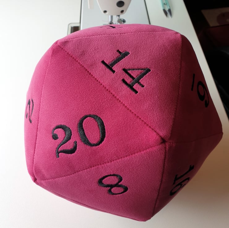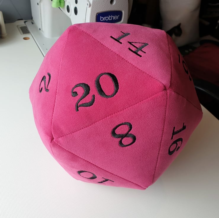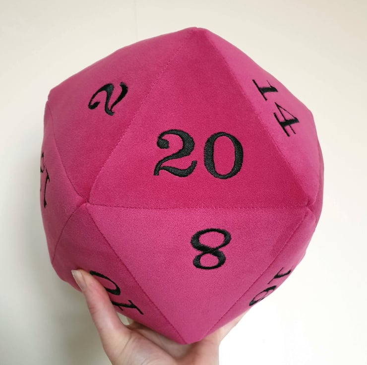 A ginormous plushie D20 in a bright pink, super soft velvet fabric.