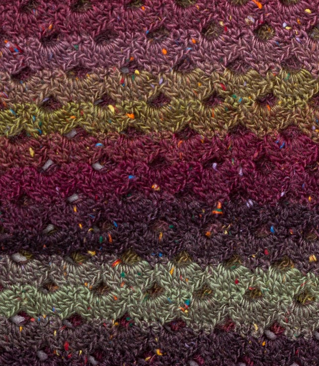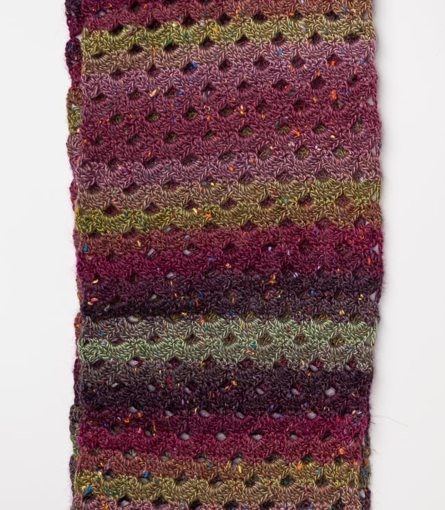This yarn is variegated and so the colour is self striping in green/maroon/purple with little flecks of white, blue and orange.