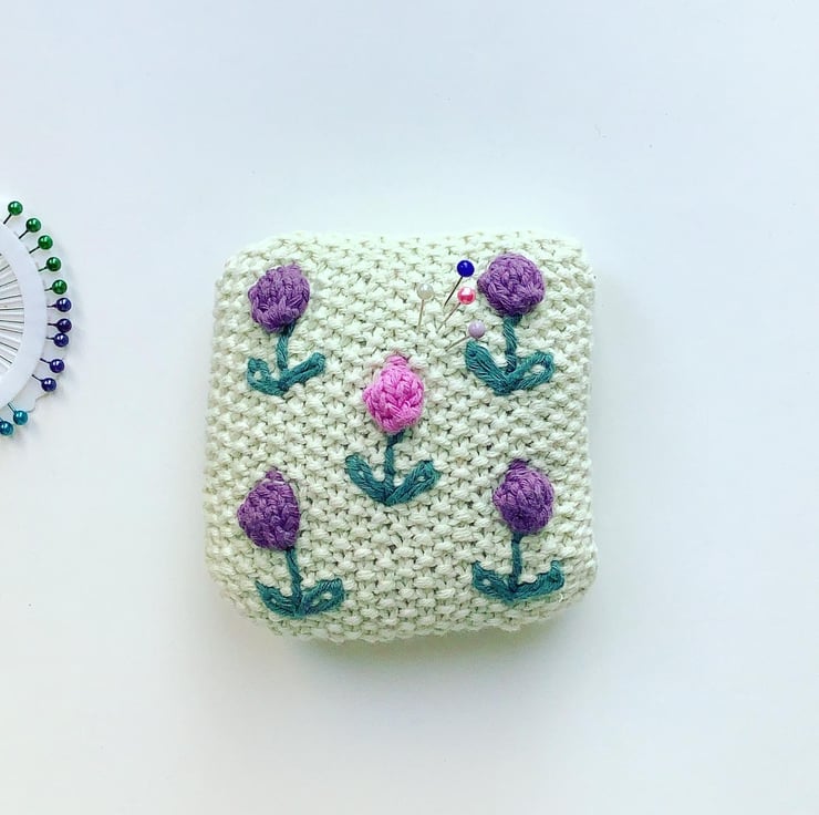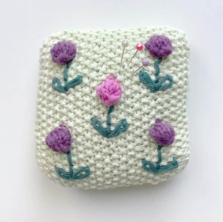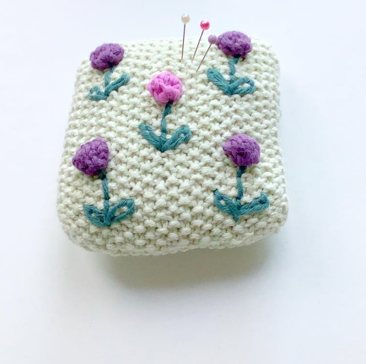 The pincushion has been knitted in moss stitch with pink and purple bobble flowers. Hand embroidered stems and leaves have been added. The background colour is eau de nil. All materials used are organic cotton. The back is plain moss stitch.