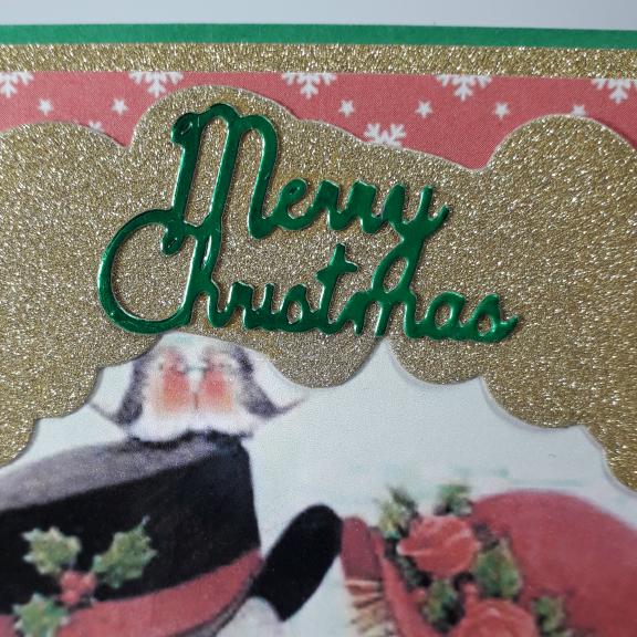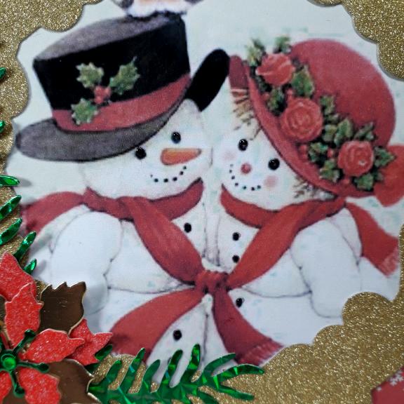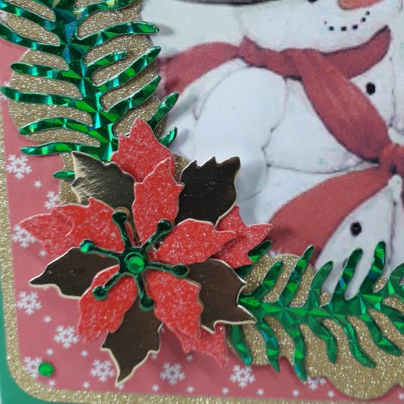 A 15 cm square card featuring a snowman and snowwoman in their festive hats, I have placed them in a glittery gold frame and added die cut foliage and poinsettia flower.