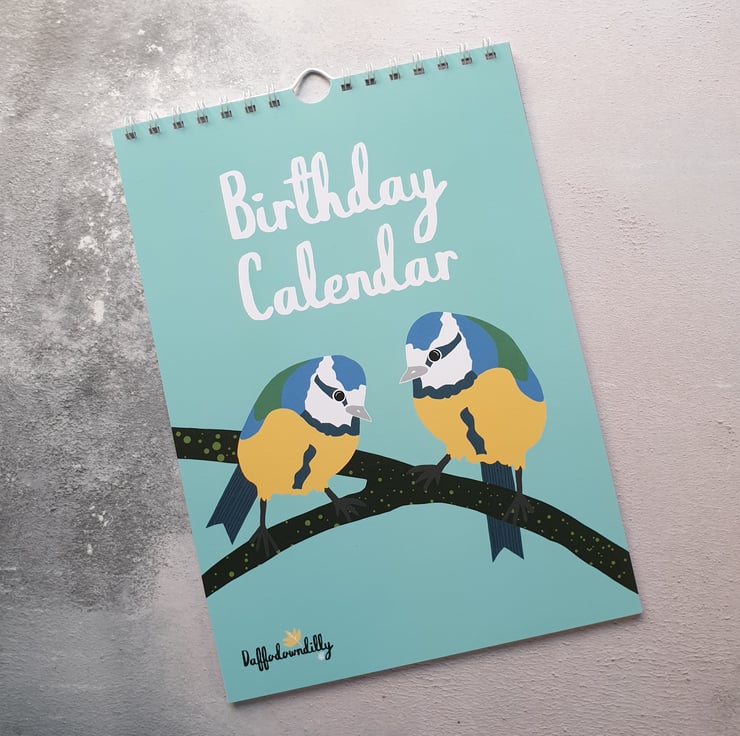 12 digitally drawn designs featuring different species of birds for each month of the year appear on this Birthday Calendar.
