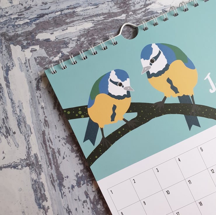 The front cover features July's design of two Bluetits and the back cover features a mini photo grid with all 12 designs. Each calendar page has a box grid format and are wire bound with a hanger to display on the wall.