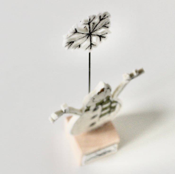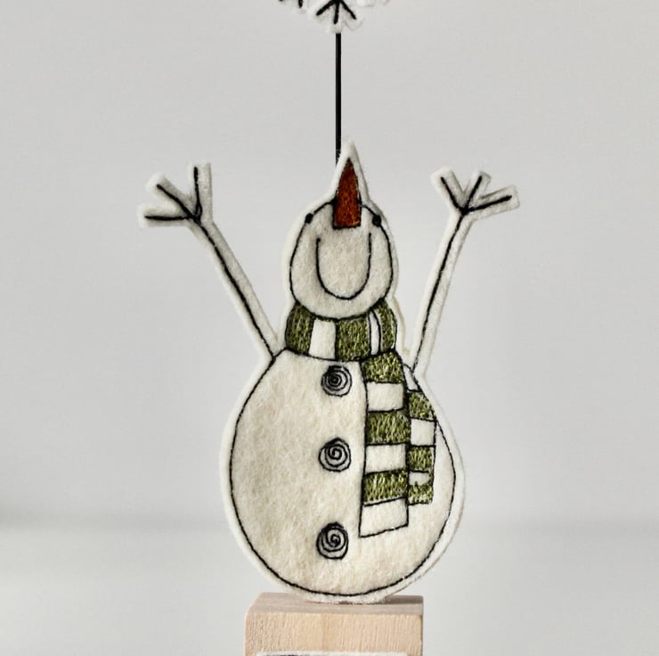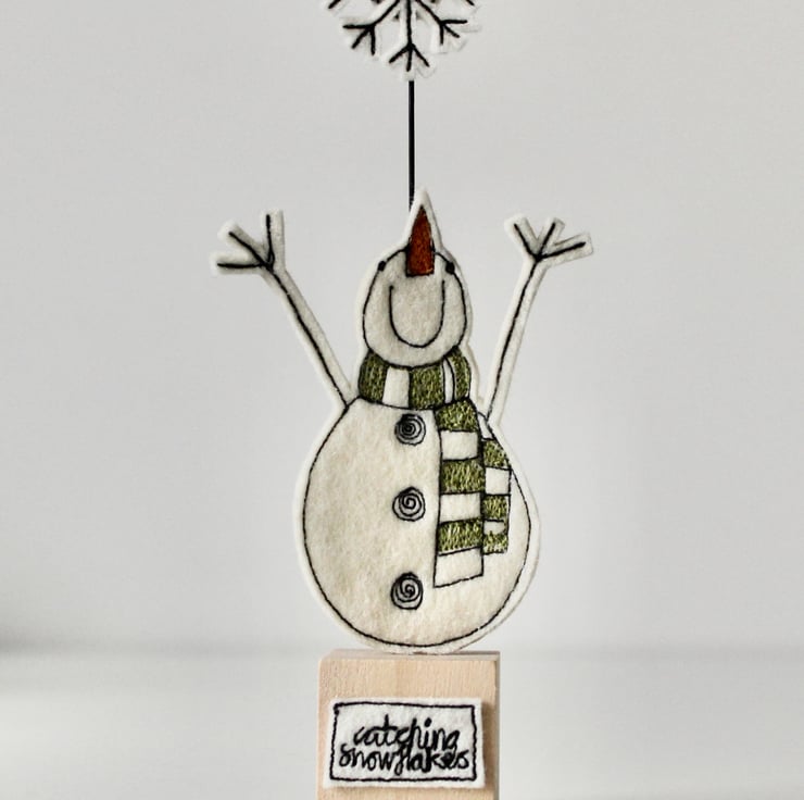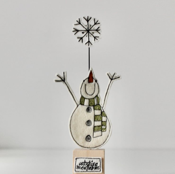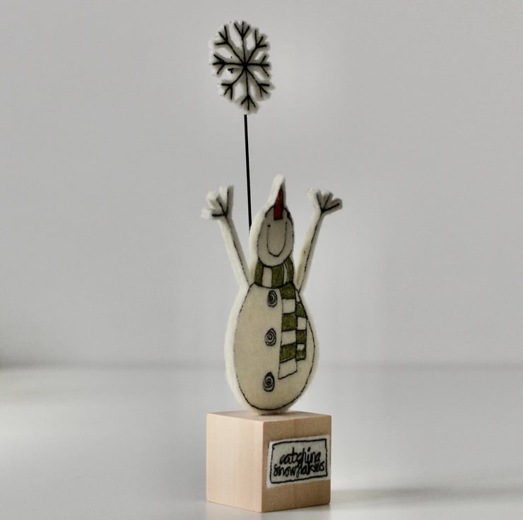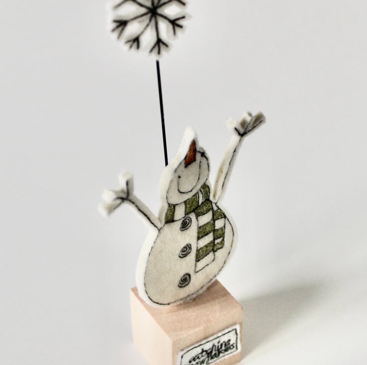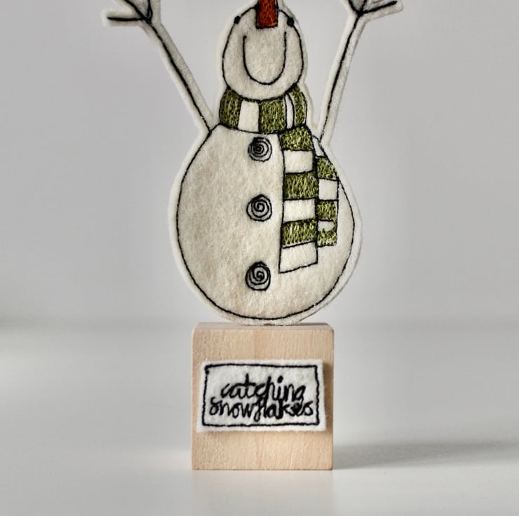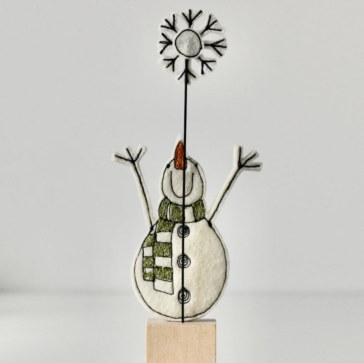 Mr Snowman is created using 100% wool felt, free hand machine embroidery and cut out by hand using very sharp scissors. He is mounted on a 3cm cube wooden block, which can adorn a mantle piece or any flat surface.