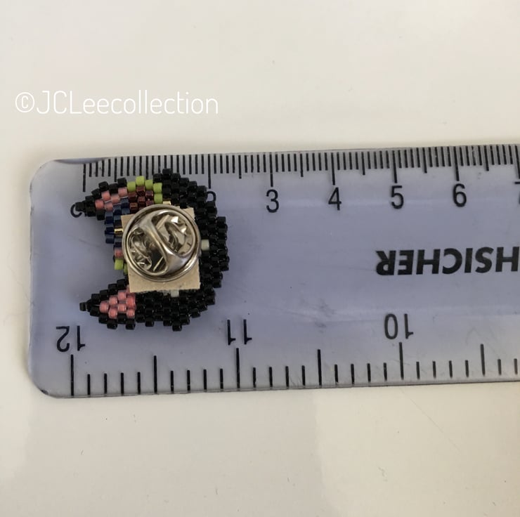 Each pin brooch, is hand woven with precision cut tiny delica beads in black with floral daisy accents.