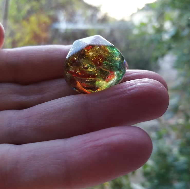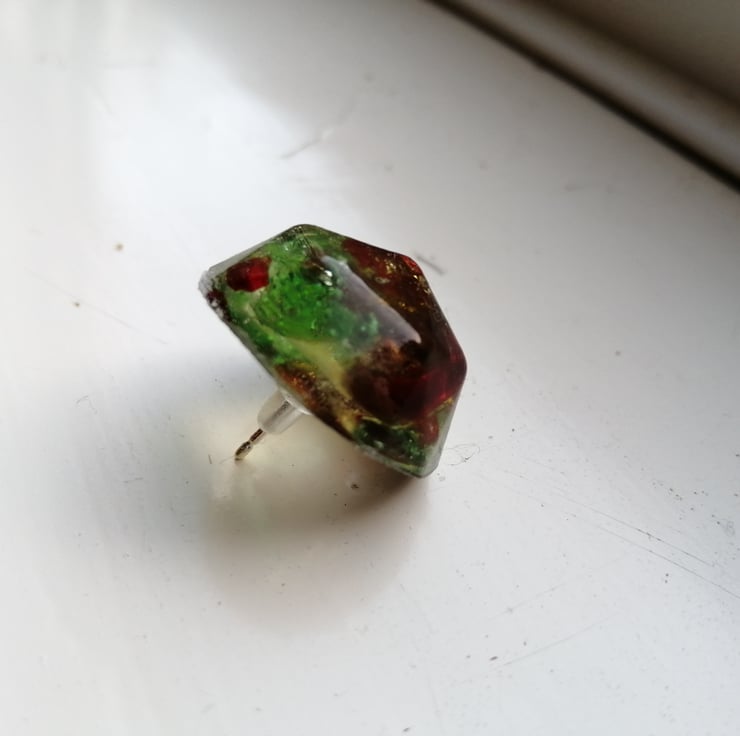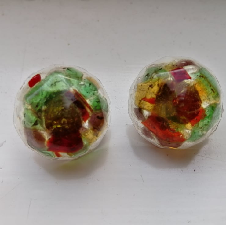These colourful drop earrings are made of tiny pieces of coloured glass set in resin. The translucent glass and resin really pick up the light and sparkle.They are sized about 2.5x2.5 x 1.5 cm and have a cut diamond type shape. The colours match the resin pendant. They have sterling silver ear pieces.