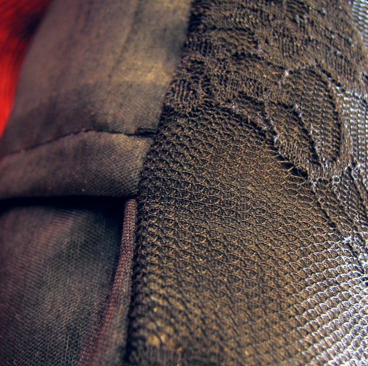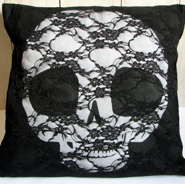 My iconic Pullip Doll Skull (That's if Pullips were real and they needed skulls...) hand-printed on to fabric and machine-stitched in to a cushion, which has a layer of lace covering the design. The back, which has a long 'pillowcase' style opening to insert the pad, is made from faux-silk, and the whole cover has a cotton lining giving it strength and durability, all machine stitched and finished by hand sewing.