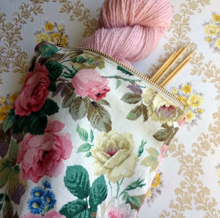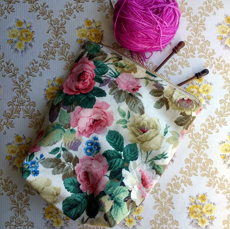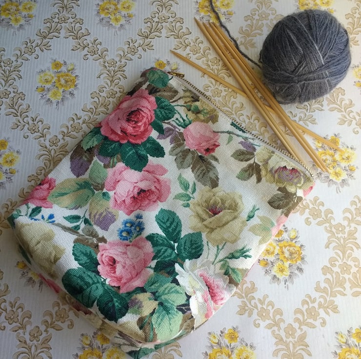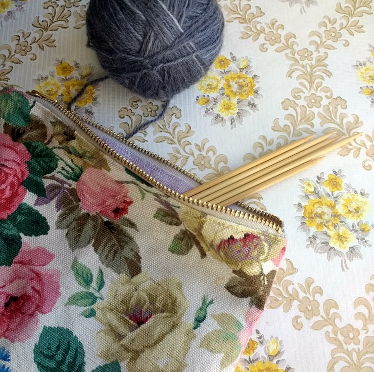 Made from a time softened and re-purposed vintage furnishing fabric, this little project bag is an ideal size for small item knitting projects such as socks, hats or mittens, or as a pretty storage for small knitting accessories and notions.