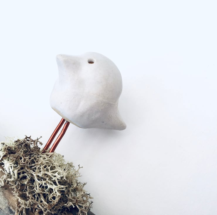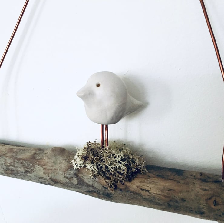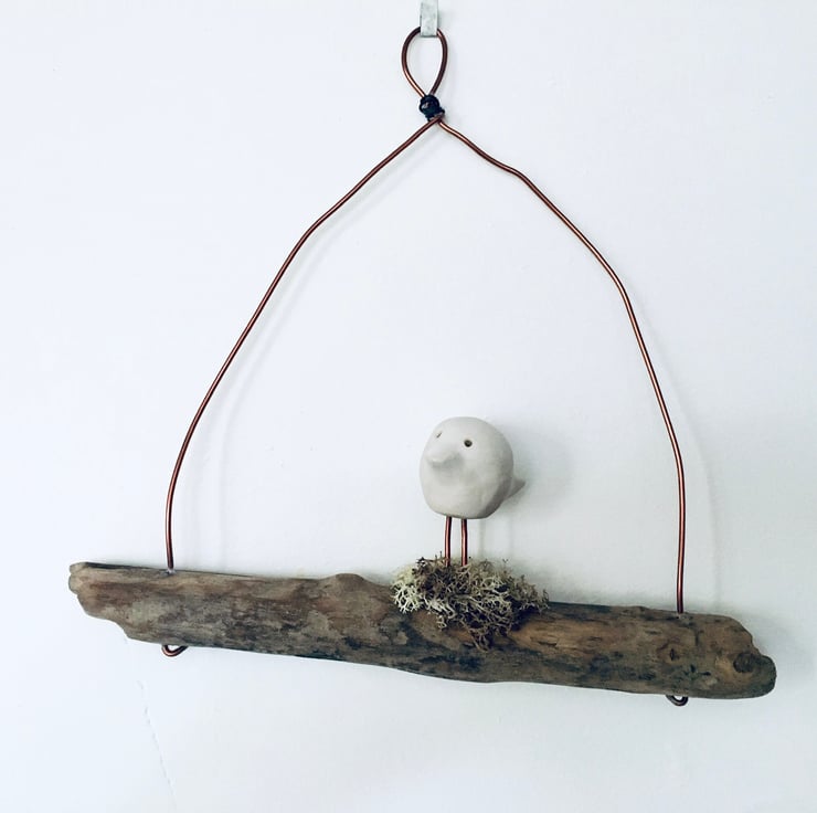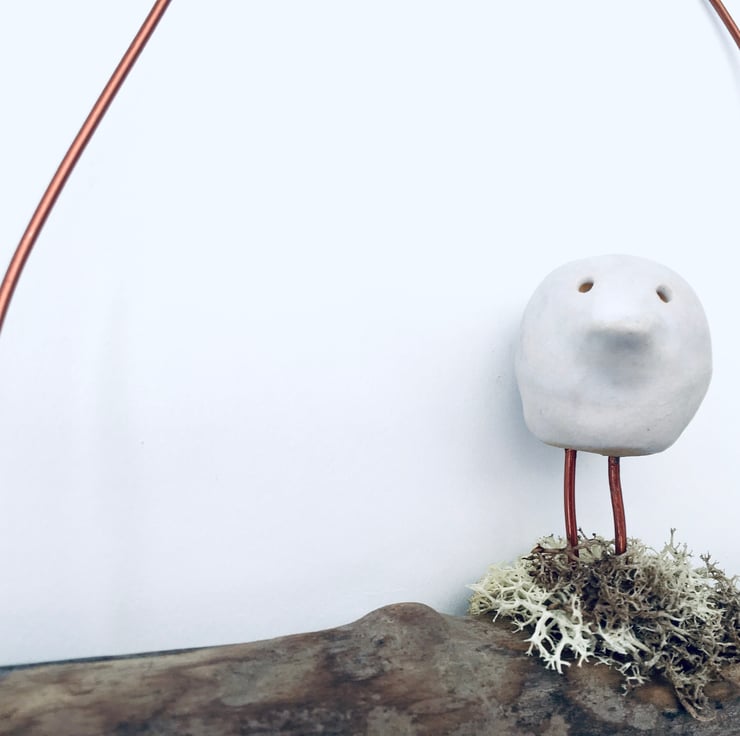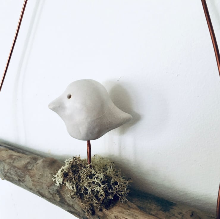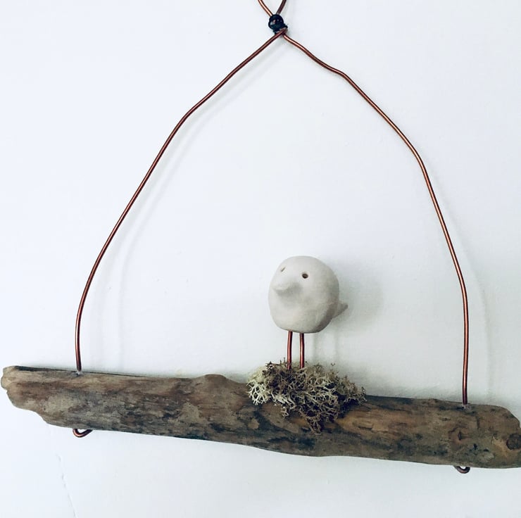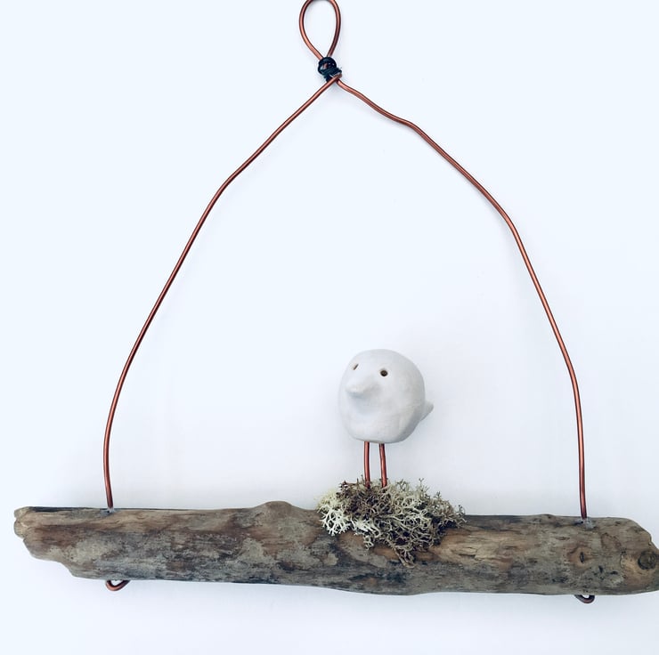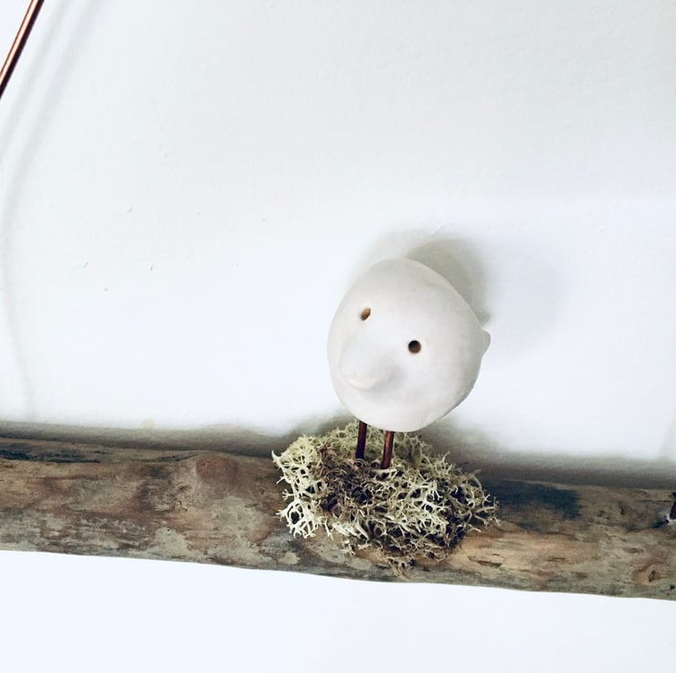 This cute piece is made as a one off design. The sweet white bird is made from Clay and sculpted using my hands. It is then fired, glazed and fired once again to high temperatures. He is then attached to a natural piece of driftwood and strung with gold coloured aluminium wire.