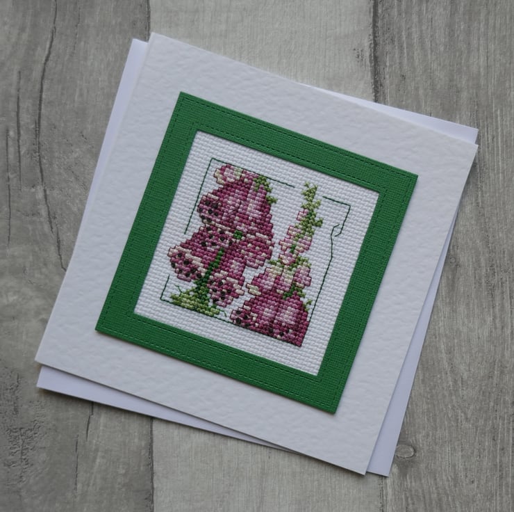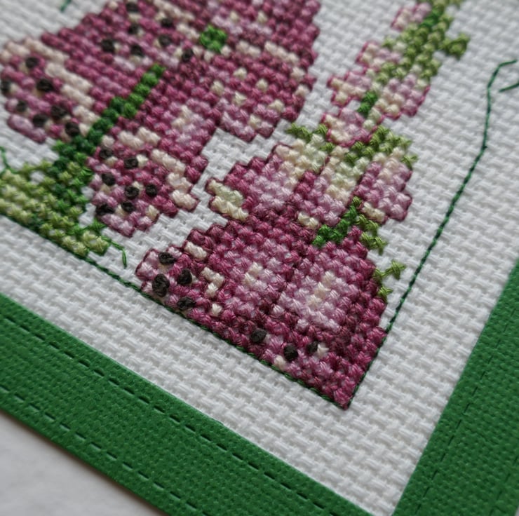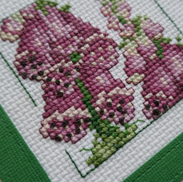 The foxgloves are from the Carolyn's Meadow collection from Serendipity Designs. They have been stitched in different shades of purple with green leaves and a backstitch green frame. The cross stitch has been mounted behind a dark green frame that matches the colour of the leaves.