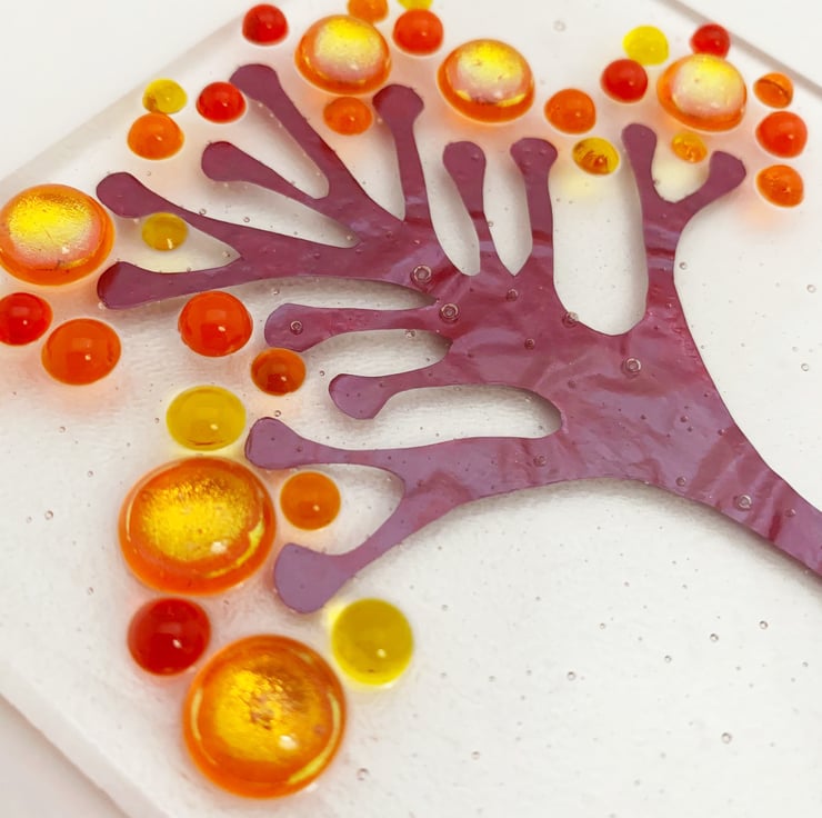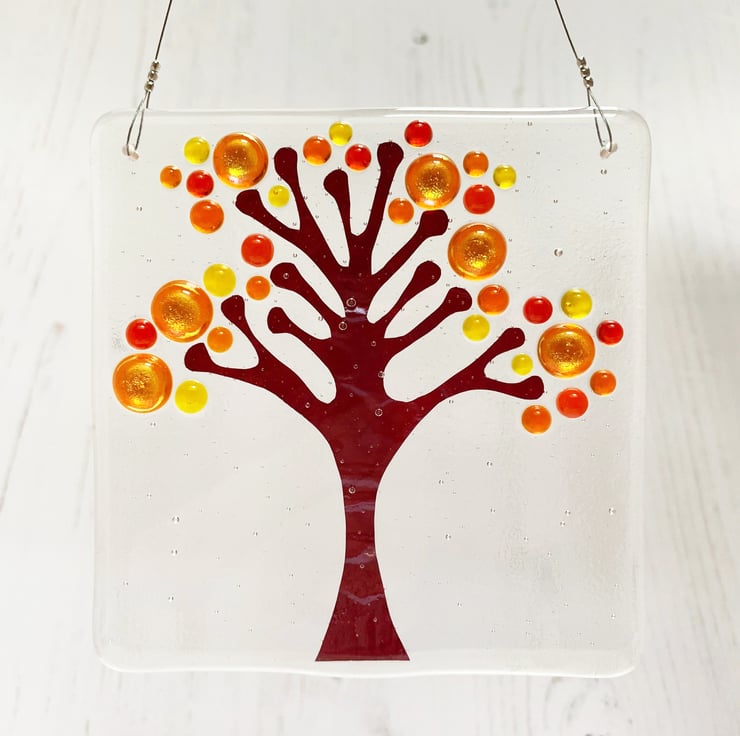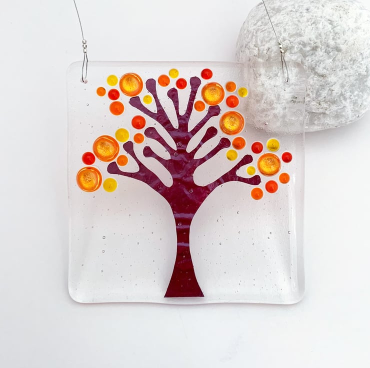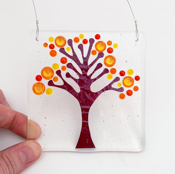 Fused glass square hanging tree suncatcher. I've used rich Autumnal coloured glass and hand cut copper tree in this suncatcher, inspired by my love of nature. A beautiful gift, it looks lovely in a window, giving a splash of colour.
