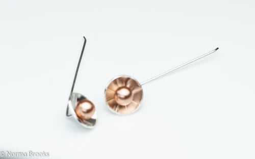 These gorgeous and unusual pearl earrings have been formed around a sterling silver 15mm slightly domed pearl cup that has been textured with linear design which reflects the light and colour of the 6mm Swarovksi Gold Glass pearl onto the sterling silver. The handmade ear wire is such that the pearl cup sits snuggly against the ear lobe. These elegant earrings make the the perfect gift or why not treat yourself !