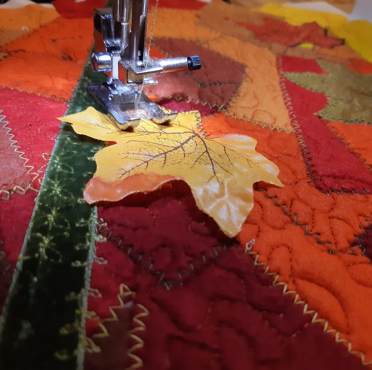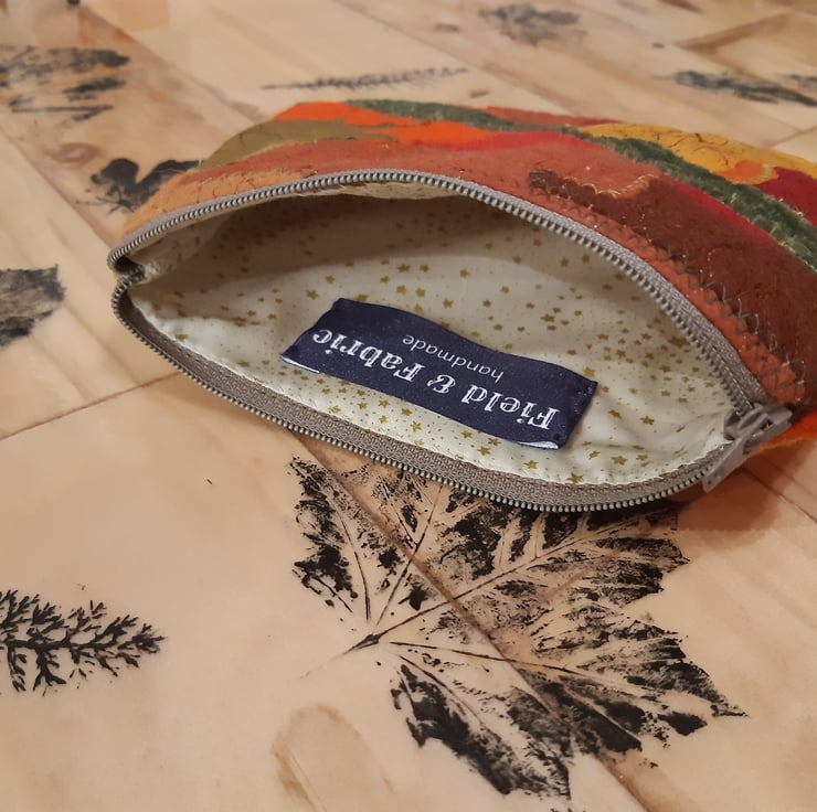 Fully lined with in cute star print cotton in cream and gold. The outside is in rich autumn colours, where small felt offcuts have been reassembled and stitched with free motion embroidery over a base fabric to create an applique patchwork.
