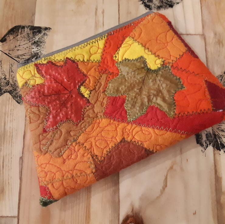 An autumn leaves themed bag, zip closure, approx 17cm x 15cm (wider at the bottom, c.20cm).