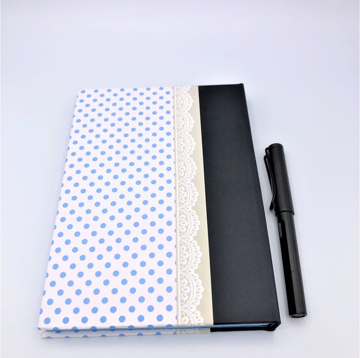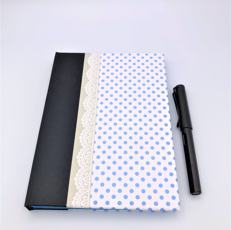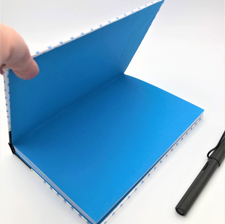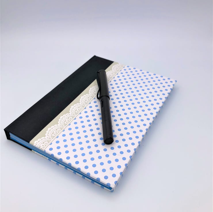 A fun white cover with blue polka dots, with a black book cloth spine covering as a lovely contrasting detail. When you open the book, you notice the signatures alternate between blue matching the cover and the white.