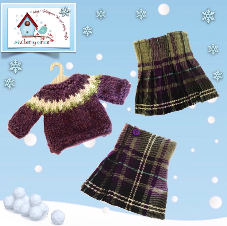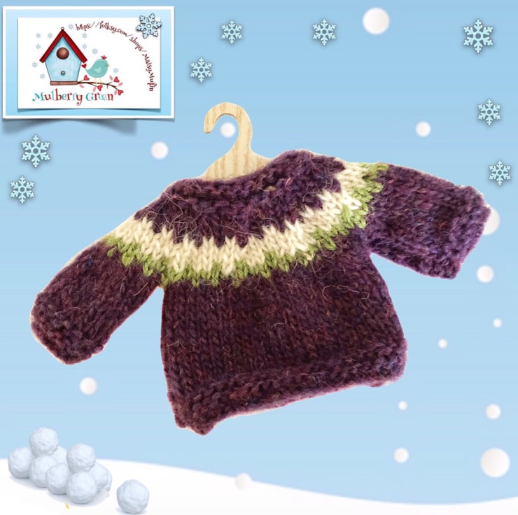 A cosy and warm purple heather jumper, handknitted in Icelandic Lopi 100% wool, made especially to fit the Mulberry Green dolls. It has a patterned yoke and comes on a little wooden hanger. It matches the heather and lovat green kilt.