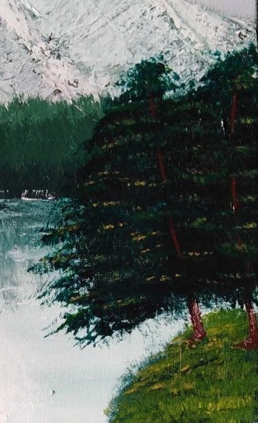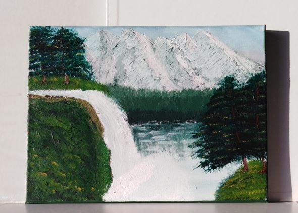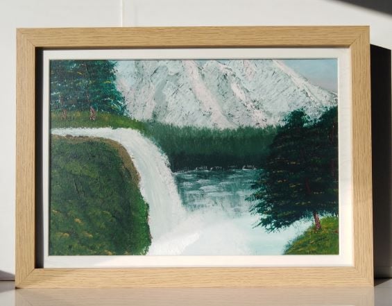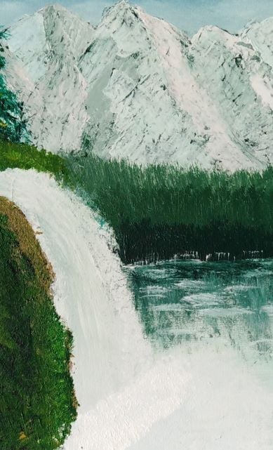 I often think about waterfalls and love the sound of them, I find them relaxing and comforting. The painting is purely from my imagination. I live close to a river and there is a small waterfall and so my inspiration often comes from there.
