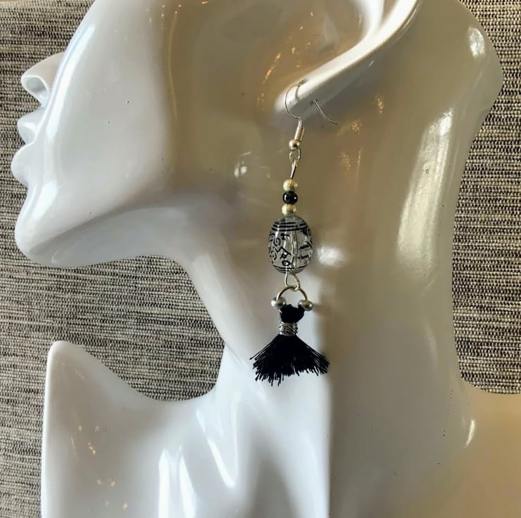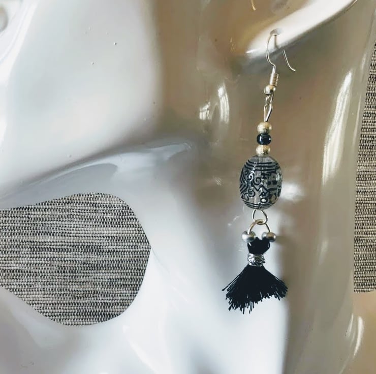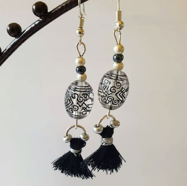 Black and clear aztec bead earrings featuring black mini tassels and mini silver colour rochelles. A tribal design which can look very stricking with most modern fashion accessories.
