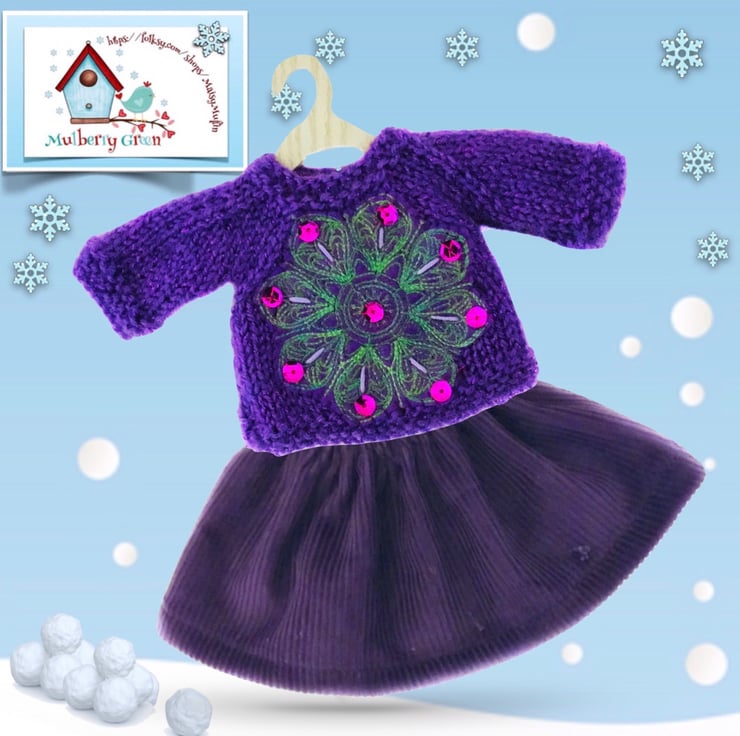 A purple corduroy skirt to fit the Mulberry Green characters. The skirt has an elasticated waist and matches the purple sequinned jumper.