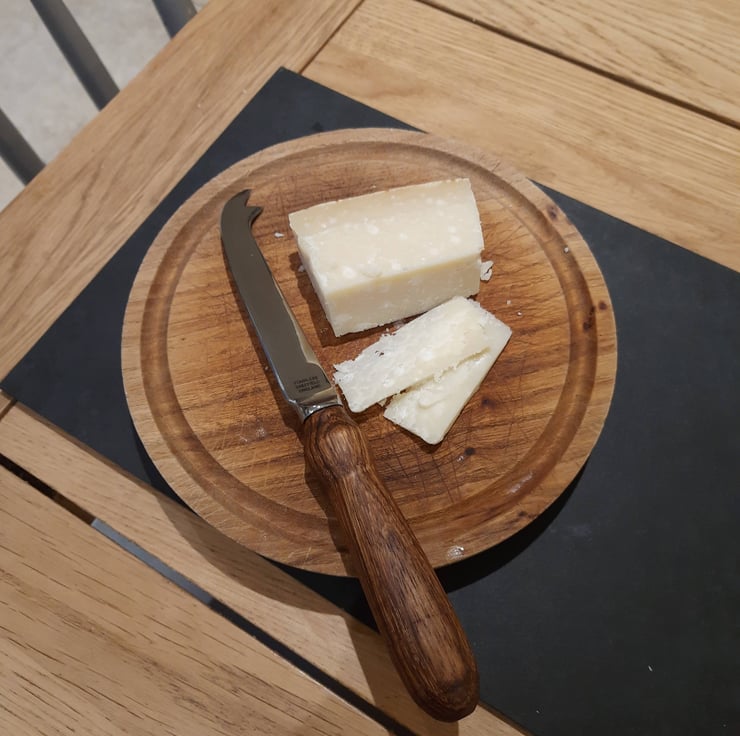 This is a custom request - a Sheffield Stainless Steel cheese knife with a handmade woodturned handle made from Zebrano (zebra wood). The handle is sanded smooth and then finished with food-safe Tung oil and a beeswax/mineral oil wax.