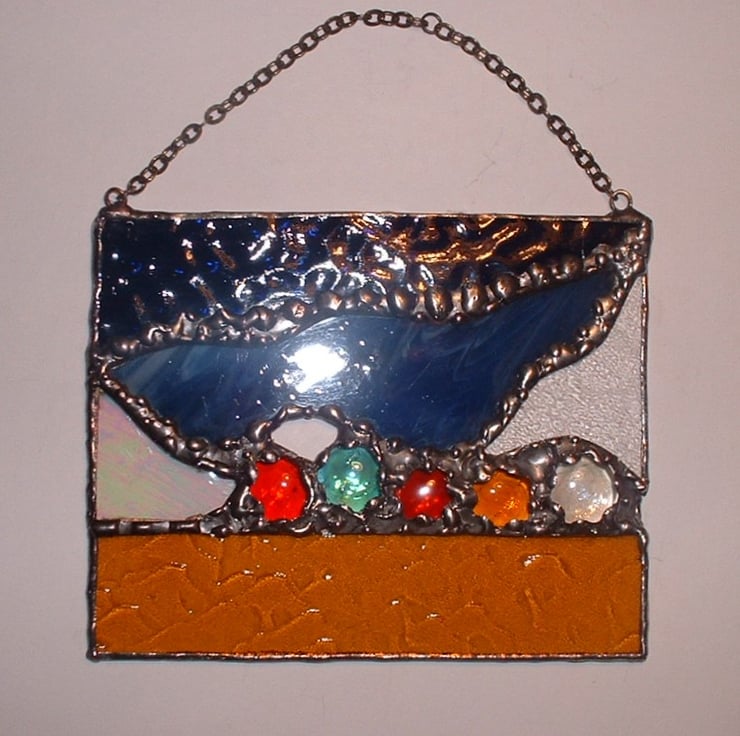 An abstract design of a rockpool with orange textured glass as the rippled sand, the two shades of blue glass as the sea with clear & iridescent glass indicating the clearness and shimmer of the water and the vivid coloured glass globs as the creatures that live there. There are no defects but I made it a while ago so hopefully it will go to a good home.