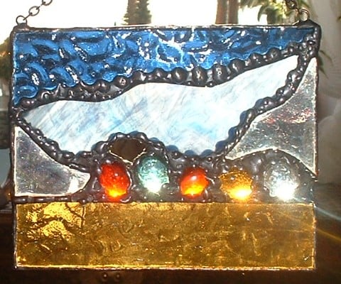 Made in the Tiffany Style each piece of glass has been cut to shape and the edges smoothed on a grinding wheel before being copper foiled and soldered together. Decorative soldering represents the seaweed and creatures growing on the rocks and the movement of the water. A light copper patina has been applied and polished to bring out the highlights.
