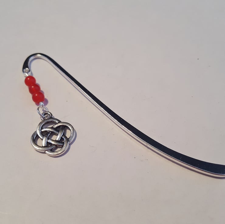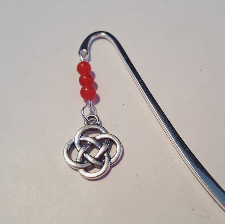 85mm Tibetan silver bookmark with 15mm Tibetan silver Celtic knot charm and three 4mm red jade beads.