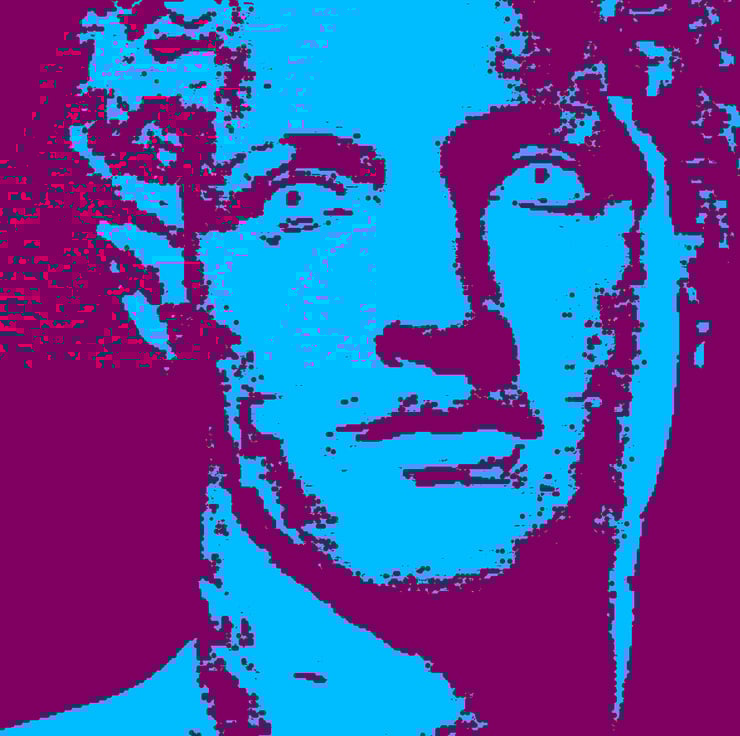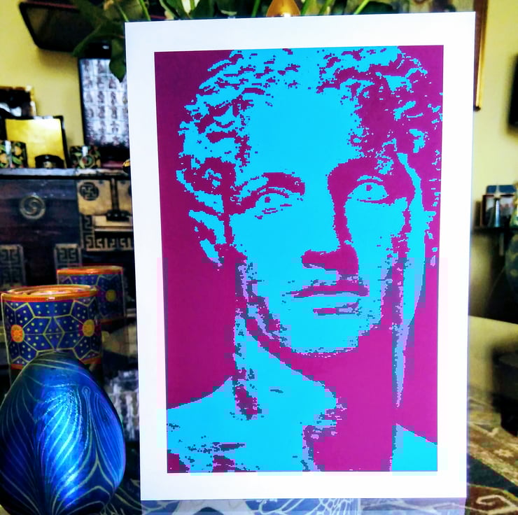 The image was actually created from one of my photographs of an ancient Greek statue to which I applied various digital processes. The result is this vibrant portrait in turquoise blue and a rich plum colour. The blue seems a fitting nod to Poseidon as God of the Seas.