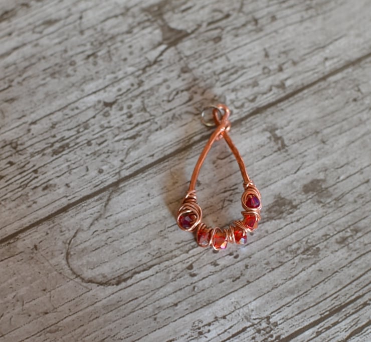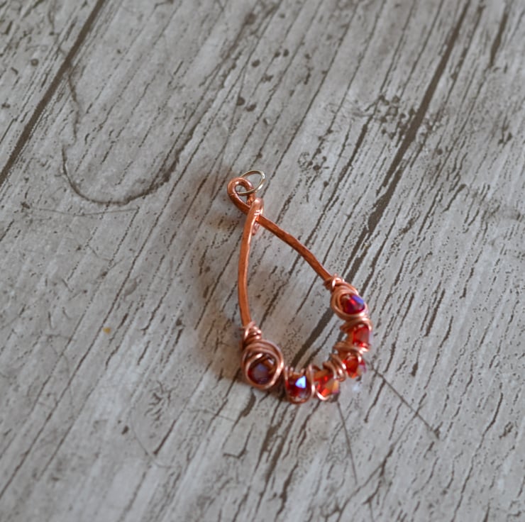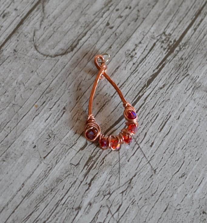 Hammered rustic copper oval shape pendant - does not include a chain. Hangs with a silver plated jump ring.Red crystal ab faceted red bicone shape beads which really catch the light have been wrapped using a copper coloured jewellery wire. The length is just under 2" taken from the top loop (not including the jump ring). Width is 2cm taken at the widest point.