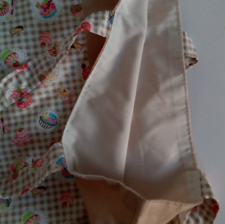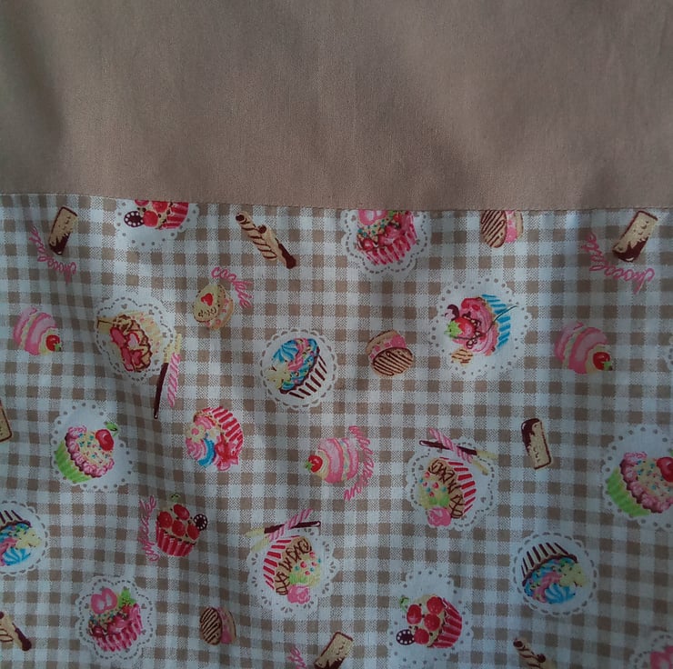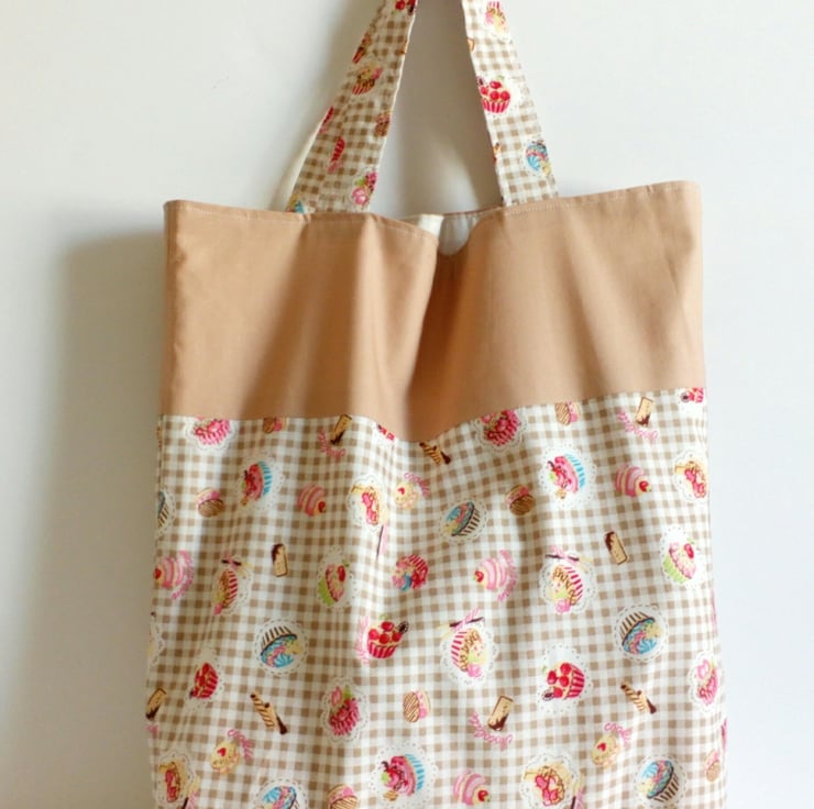 This is a shopping bag/tote with a cupcake print and a cream lining. It is made from cotton with a Polycotton lining.